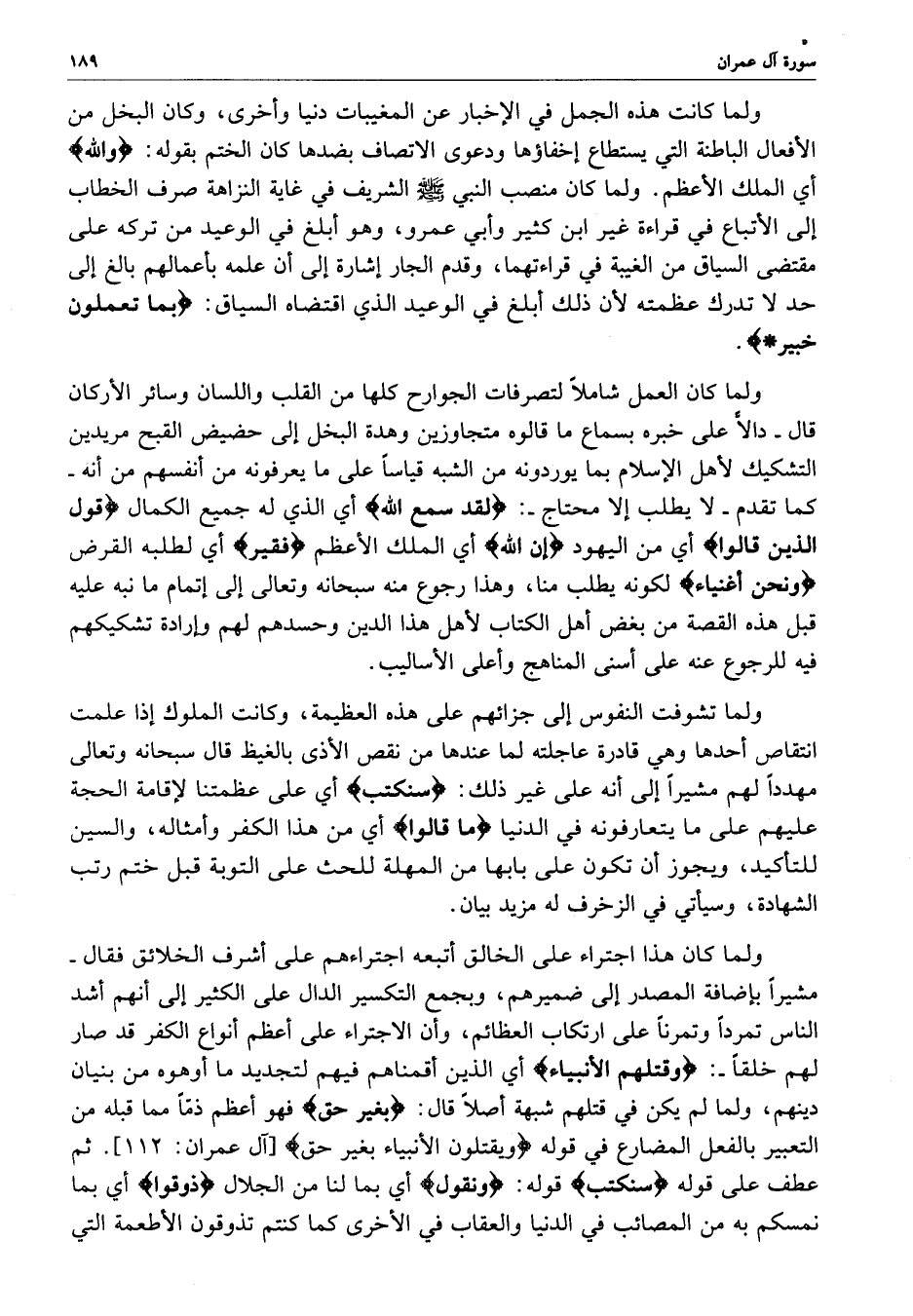 ولما كان منصب النبي ( صلى الله عليه وسلم ) الشريف في غاية النزاهة صرف الخطاب إلى الأتباع في قراءة غير ابن كثير وأبي عمرو ، وهو أبلغ في الوعيد من تركه على مقتضى السياق من الغيبة في قراءتهما ، وقدم الجار إشارة إلى أن علمه بأعمالهم بالغ إلى حد لا تدرك عظمته لأن ذلك أبلغ في الوعيد الذي اقتضاه السياق : ( بما تعملون خبير ( ولما كان العمل شاملاً لتصرفات الجوارح كلها من القلب واللسان وسائر الأركان قال - دالاًّ على خبره بسماع ما قالوه متجاوزين وهذه البخل إلى حضيض القبح مرريدين التشكيك لأهل الإسلام بما يوردونه من الشبه قياساً على ما يعرفونه من أنفسهم من أنه - كما تقدم - لا يطلب إلا محتاج - : ( لقد سمع الله ) أي الذي له جميع الكمال ) قول الذين قالوا ) أي من اليهود ) إن الله ) أي الملك الأعظم ) فقير ) أي لطلبه القرض ) ونحن أغنياء ( لكونه يطلب منا ، وهذا رجوع منه سبحانه وتعالى إلى إتمام ما نبه عليه قبل هذه القصة من بغض أهل الكتاب لأهل هذا الدين وحسدهم لهم وإرادة تشكيكهم فيه للرجوع عنه على أسنى المناهج وأعلى الأساليب .