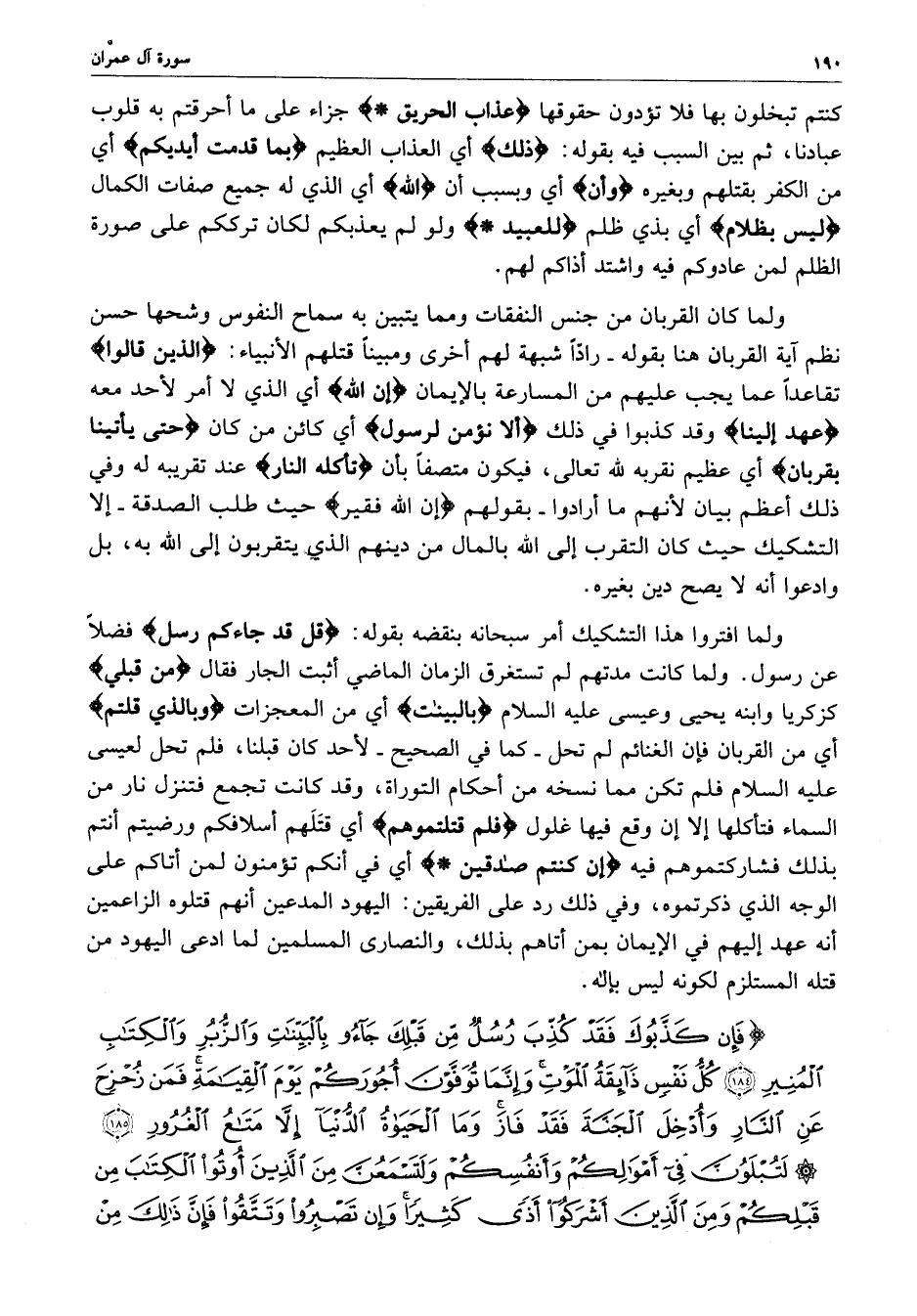 ) فَإِن كَذَّبُوكَ فَقَدْ كُذِّبَ رُسُلٌ مِّن قَبْلِكَ جَآءُوا بِالْبَيِّنَاتِ وَالزُّبُرِ وَالْكِتَابِ الْمُنِيرِ كُلُّ نَفْسٍ ذَآئِقَةُ الْمَوْتِ وَإِنَّمَا تُوَفَّوْنَ أُجُورَكُمْ يَوْمَ الْقِيَامَةِ فَمَن زُحْزِحَ عَنِ النَّارِ وَأُدْخِلَ الْجَنَّةَ فَقَدْ فَازَ وَما الْحَيَاةُ الدُّنْيَا إِلاَّ مَتَاعُ الْغُرُورِ لَتُبْلَوُنَّ فِي أَمْوَالِكُمْ وَأَنْفُسِكُمْ وَلَتَسْمَعُنَّ مِنَ الَّذِينَ أُوتُواْ الْكِتَابَ مِن قَبْلِكُمْ وَمِنَ الَّذِينَ أَشْرَكُواْ أَذًى كَثِيراً وَإِن تَصْبِرُواْ وَتَتَّقُواْ فَإِنَّ ذلِكَ مِنْ