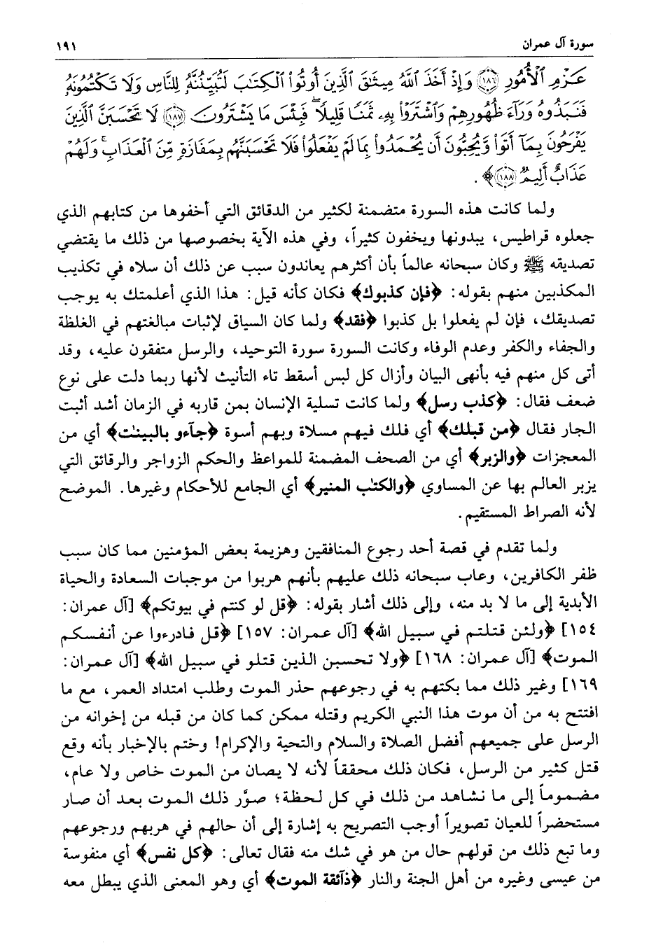 عَزْمِ الأُمُورِ وَإِذَ أَخَذَ اللَّهُ مِيثَاقَ الَّذِينَ أُوتُواْ الْكِتَابَ لَتُبَيِّنُنَّهُ لِلنَّاسِ وَلاَ تَكْتُمُونَهُ فَنَبَذُوهُ وَرَآءَ ظُهُورِهِمْ وَاشْتَرَوْاْ بِهِ ثَمَناً قَلِيلاً فَبِئْسَ مَا يَشْتَرُونَ لاَ تَحْسَبَنَّ الَّذِينَ يَفْرَحُونَ بِمَآ أَتَوْاْ وَّيُحِبُّونَ أَن يُحْمَدُواْ بِمَا لَمْ يَفْعَلُواْ فَلاَ تَحْسَبَنَّهُمْ بِمَفَازَةٍ مِّنَ الْعَذَابِ وَلَهُمْ عَذَابٌ أَلِيمٌ ) 73