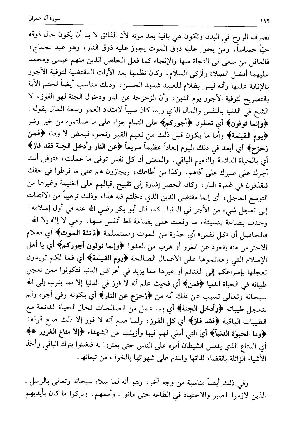 تصرف الروح في البدن وتكون هي باقية بعد موته لأن الذائق لا بد أن يكون حال ذوقه حيّاَ حساساً ، ومن يجوز عليه ذوق الموت يجوز عليه ذوق النار ، وهو عبد محتاج ، فالعاقل من سعى في النجاة منها والإنجاء كما فعل الخلص الذين منهم عيسى ومحمد علهيما أفضل الصلاة وأزكى السلام ، وكان نظمها بعد الآيات المقتضية لتوفية الأجور بالإثابة عليها وأنه ليس بظلام للعبيد شديد الحسن ، وذلك مناسب أيضاً لختم الآية بالتصريح لتوفية الأجور يوم الدين ، وأن الزحزحة عن النار ودخول الجنة لهو الفوز ، لا الشح في الدنيا بالنفس والمال الذي ربما كان سبباً لامتداد العمر وسعة المال بقوله : ( وإنما توفون ) أي تعطون ) أجوركم ( على التمام جزاء على ما عملتموه من خير وشر ) يوم القيامة ( وأما ما يكون قبل ذلك من نعيم القبر ونحوه فبعض لا وفاء ) فمن زحزح ) أي أبعد في ذلك اليوم إبعاداً عظيماً سريعاً ) عن النار وأدخل الجنة فقد فاز ) أي بالحياة الدائمة والنعيم الباقي .