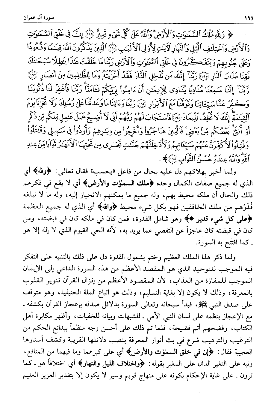 ) وَللَّهِ مُلْكُ السَّمَاوَاتِ وَالأَرْضِ وَاللَّهُ عَلَى كُلِّ شَيْءٍ قَدِيرٌ إِنَّ فِي خَلْقِ السَّمَاوَاتِ وَالأَرْضِ وَاخْتِلاَفِ الْلَّيْلِ وَالنَّهَارِ لآيَاتٍ لأُوْلِي الأَلْبَابِ الَّذِينَ يَذْكُرُونَ اللَّهَ قِيَاماً وَقُعُوداً وَعَلَى جُنُوبِهِمْ وَيَتَفَكَّرُونَ فِي خَلْقِ السَّمَاوَاتِ وَالأَرْضِ رَبَّنَآ مَا خَلَقْتَ هَذا بَاطِلاً سُبْحَانَكَ فَقِنَا عَذَابَ النَّارِ رَبَّنَآ إِنَّكَ مَن تُدْخِلِ النَّارَ فَقَدْ أَخْزَيْتَهُ وَمَا لِلظَّالِمِينَ مِنْ أَنْصَارٍ رَّبَّنَآ إِنَّنَآ سَمِعْنَا مُنَادِياً يُنَادِي لِلإِيمَانِ أَنْ آمِنُواْ بِرَبِّكُمْ فَآمَنَّا رَبَّنَا فَاغْفِرْ لَنَا ذُنُوبَنَا وَكَفِّرْ عَنَّا سَيِّئَاتِنَا وَتَوَفَّنَا مَعَ الأَبْرَارِ رَبَّنَا وَآتِنَا مَا وَعَدتَّنَا عَلَى رُسُلِكَ وَلاَ تُخْزِنَا يَوْمَ الْقِيَامَةِ إِنَّكَ لاَ تُخْلِفُ الْمِيعَادَ فَاسْتَجَابَ لَهُمْ رَبُّهُمْ أَنِّي لاَ أُضِيعُ عَمَلَ عَامِلٍ مِّنْكُمْ مِّن ذَكَرٍ أَوْ أُنْثَى بَعْضُكُم مِّن بَعْضٍ فَالَّذِينَ هَاجَرُواْ وَأُخْرِجُواْ مِن دِيَارِهِمْ وَأُوذُواْ فِي سَبِيلِي وَقَاتَلُواْ وَقُتِلُواْ لأُكَفِّرَنَّ عَنْهُمْ سَيِّئَاتِهِمْ وَلأُدْخِلَنَّهُمْ جَنَّاتٍ تَجْرِي مِن تَحْتِهَا الأَنْهَارُ ثَوَاباً مِّن عِندِ اللَّهِ وَاللَّهُ عِندَهُ حُسْنُ الثَّوَابِ ( ( )