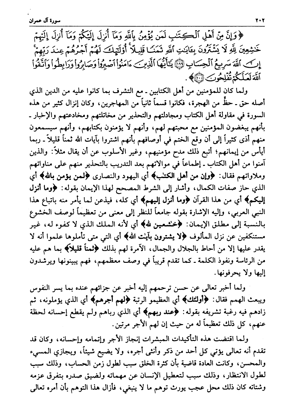 ) وَإِنَّ مِنْ أَهْلِ الْكِتَابِ لَمَن يُؤْمِنُ بِاللَّهِ وَمَآ أُنزِلَ إِلَيْكُمْ وَمَآ أُنزِلَ إِلَيْهِمْ خَاشِعِينَ للَّهِ لاَ يَشْتَرُونَ بِآيَاتِ اللَّهِ ثَمَناً قَلِيلاً أُوْلئِكَ لَهُمْ أَجْرُهُمْ عِندَ رَبِّهِمْ إِنَّ اللَّهَ سَرِيعُ الْحِسَابِ يَاأَيُّهَا الَّذِينَ آمَنُواْ اصْبِرُواْ وَصَابِرُواْ وَرَابِطُواْ وَاتَّقُواْ اللَّهَ لَعَلَّكُمْ تُفْلِحُونَ ( ( )