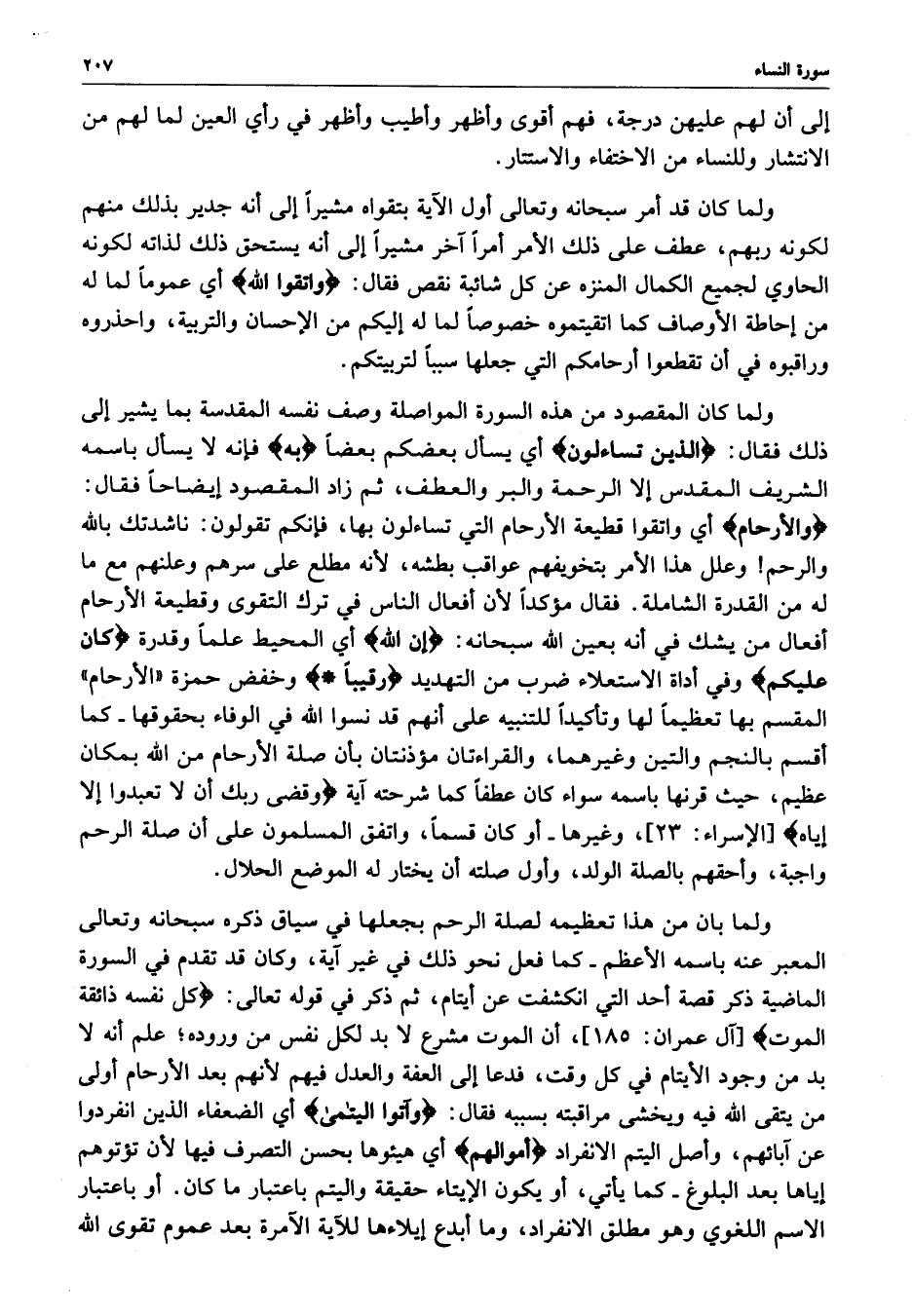 ولما كان المقصود من هذه السورة المواصلة وصف نفسه المقدسة بما يشير إلى ذلك فقال : ( الذين تساءلون ) أي يسأل بعضكم بعضاً ) به ( فإنه لا يسأل باسمه الشريف المقدس إلا الرحمة والبر والعطف ، ثم زاد المقصود إيضاحاً فقال : ( والأرحام ) أي واتقوا قطيعة الأرحام التي تساءلون بها ، فإنكم تقولون : ناشدتك بالله والرحم وعلل هذا الأمر بتخويفهم عواقب بطشه ، لأ ، ه مطلع على سرهم وعلنهم مع ما له من القدرة الشاملة .