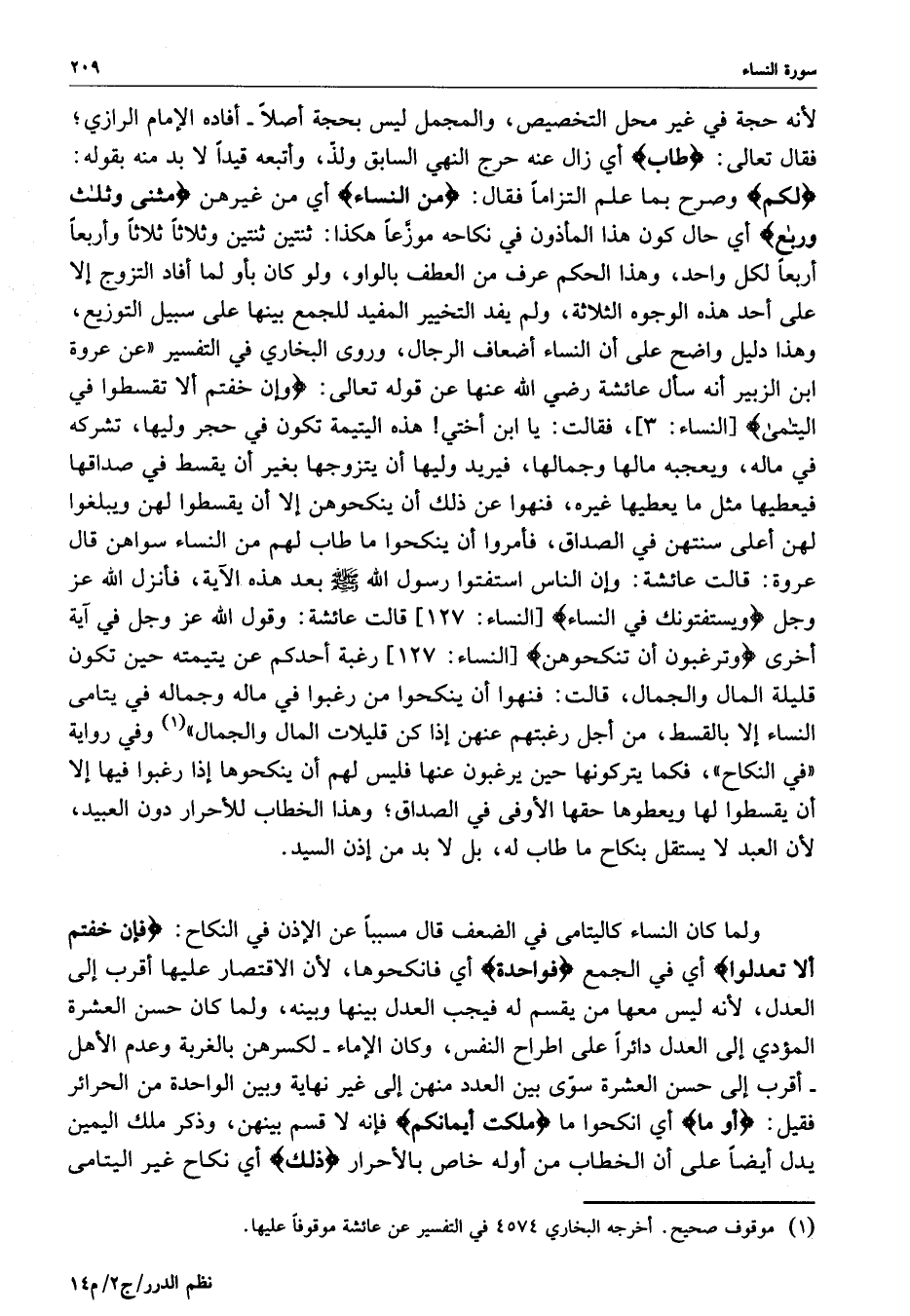 [ النساء : 127 ] رغبة أحدكم عن يتيمته حين تكون قليلة المال والجمال ، قالت : فنهوا أن ينكحوا من رغبوا في ماله وجماله في يتامى النساء إلا بالقسط ، من أجل رغبتهم عنهم إذا كن قليلات المال والجمال ) وفي رواية ( في النكاح ) ، فكما يتركونها حين يرغبون عنها فليس لهم أن ينكحوها إذا رغبوا فيها إلا أن يقسطوا لها ويعطوها حقها الأوفى في الصداق ؛ وهذا الخطاب للأحرار دون العبيد ، لأن العبد لا يستقل بنكاح ما طاب له ، بل لا بد من إذن السيد .