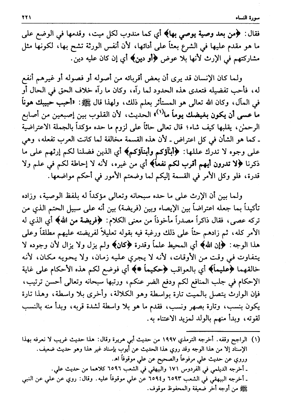 فقال : ( من بعد وصية يوصي بها ) أي كما مندوب لكل ميت ، وقدمها في الوضع على ما هو مقدم عليها في الشرع بعثاً على أدائها ، لأن أنفس الورثة تشح بها ، لكونها مثل مشاركتهم في الإرث لأنها بلا عوض ) أو دين ) أي إن كان عليه دين ولما كان الإنسان قد يرى أن بعض أقربائه من أصوله أو فصوله أو غيرهم أنفع له ، فأحب تفضيله فتعدى هذه الحدود لما رآه ، وكان ما رآه خلاف الحق في الحال أو في المآل ، وكان الله تعالى هو المستأثر بعلم ذلك ، ولهذا قال ( صلى الله عليه وسلم ) : ( أحبب حبيبك هوناً ما عسى أن يكون بغيضك يوماَ ما ) الحديث : لأن القلوب بين إصبعين من أصابع الرحمن ، يقلبها كيف شاء ؛ قال تعالى حاثاً على لزوم ما حده مؤكداً بالجملة الاعتراضية - كما هو الشأن في اعتراض - لأن هذه القسمة مخالفة لما كانت العرب تفعله ، وهي على وجوه لاتدرك عللها : ( أبآؤكم وأبنآؤكم ) أي الذين فضلنا لكم إرثهم على ما ذكرنا ) لا تدرون أيهم أقرب لكم نفعاً ) أي من غيره ، لأنه لا إحاطة لكم في علم ولا قدرة ، فلو وكل الأمر في القسمة إليكم لما وضعتم الأمور في أحكم مواضعها .