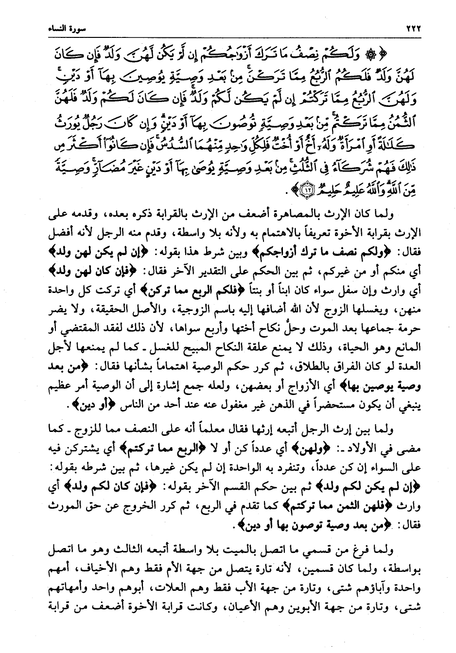 ) وَلَكُمْ نِصْفُ مَا تَرَكَ أَزْوَاجُكُمْ إِنْ لَّمْ يَكُنْ لَّهُنَّ وَلَدٌ فَإِن كَانَ لَهُنَّ وَلَدٌ فَلَكُمُ الرُّبُعُ مِمَّا تَرَكْنَ مِن بَعْدِ وَصِيَّةٍ يُوصِينَ بِهَآ أَوْ دَيْنٍ وَلَهُنَّ الرُّبُعُ مِمَّا تَرَكْتُمْ إِن لَّمْ يَكُنْ لَّكُمْ وَلَدٌ فَإِن كَانَ لَكُمْ وَلَدٌ فَلَهُنَّ الثُّمُنُ مِمَّا تَرَكْتُم مِّن بَعْدِ وَصِيَّةٍ تُوصُونَ بِهَآ أَوْ دَيْنٍ وَإِن كَانَ رَجُلٌ يُورَثُ كَلاَلَةً أَو امْرَأَةٌ وَلَهُ أَخٌ أَوْ أُخْتٌ فَلِكُلِّ وَاحِدٍ مِّنْهُمَا السُّدُسُ فَإِن كَانُواْ أَكْثَرَ مِن ذلِكَ فَهُمْ شُرَكَآءُ فِي الثُّلُثِ مِن بَعْدِ وَصِيَّةٍ يُوصَى بِهَآ أَوْ دَيْنٍ غَيْرَ مُضَآرٍّ وَصِيَّةً مِّنَ اللَّهِ وَاللَّهُ عَلِيمٌ حَلِيمٌ ( ( )
