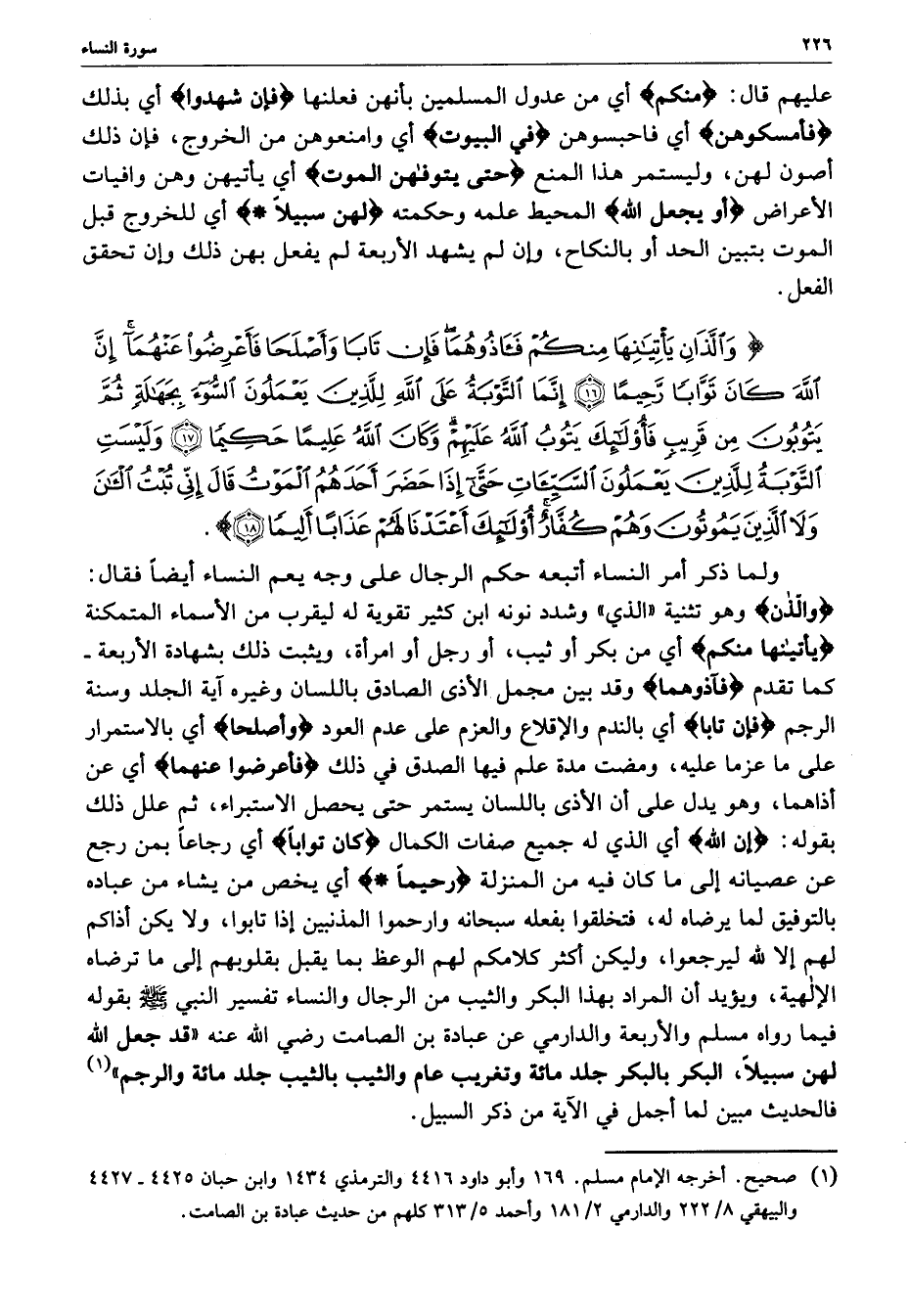 ) وَاللَّذَانَ يَأْتِيَانِهَا مِنكُمْ فَآذُوهُمَا فَإِن تَابَا وَأَصْلَحَا فَأَعْرِضُواْ عَنْهُمَآ إِنَّ اللَّهَ كَانَ تَوَّاباً رَّحِيماً إِنَّمَا التَّوْبَةُ عَلَى اللَّهِ لِلَّذِينَ يَعْمَلُونَ السُّوءَ بِجَهَالَةٍ ثُمَّ يَتُوبُونَ مِن قَرِيبٍ فَأُوْلَئِكَ يَتُوبُ اللَّهُ عَلَيْهِمْ وَكَانَ اللَّهُ عَلِيماً حَكِيماً وَلَيْسَتِ التَّوْبَةُ لِلَّذِينَ يَعْمَلُونَ السَّيِّئَاتِ حَتَّى إِذَا حَضَرَ أَحَدَهُمُ الْمَوْتُ قَالَ إِنِّي تُبْتُ الآنَ وَلاَ الَّذِينَ يَمُوتُونَ وَهُمْ كُفَّارٌ أُوْلَئِكَ أَعْتَدْنَا لَهُمْ عَذَاباً أَلِيماً ( ( )