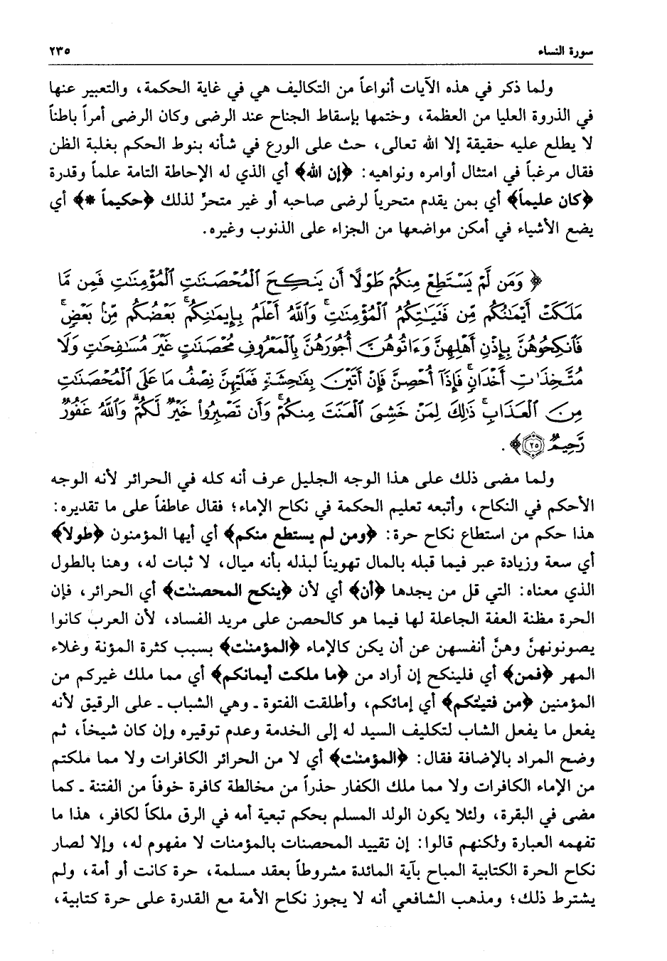 ) وَمَن لَّمْ يَسْتَطِعْ مِنكُمْ طَوْلاً أَن يَنكِحَ الْمُحْصَنَاتِ الْمُؤْمِنَاتِ فَمِنْ مَّا مَلَكَتْ أَيْمَانُكُم مِّن فَتَيَاتِكُمُ الْمُؤْمِنَاتِ وَاللَّهُ أَعْلَمُ بِإِيمَانِكُمْ بَعْضُكُمْ مِّن بَعْضٍ فَانكِحُوهُنَّ بِإِذْنِ أَهْلِهِنَّ وَآتُوهُنَّ أُجُورَهُنَّ بِالْمَعْرُوفِ مُحْصَنَاتٍ غَيْرَ مُسَافِحَاتٍ وَلاَ مُتَّخِذَاتِ أَخْدَانٍ فَإِذَآ أُحْصِنَّ فَإِنْ أَتَيْنَ بِفَاحِشَةٍ فَعَلَيْهِنَّ نِصْفُ مَا عَلَى الْمُحْصَنَاتِ مِنَ الْعَذَابِ ذَلِكَ لِمَنْ خَشِيَ الْعَنَتَ مِنْكُمْ وَأَن تَصْبِرُواْ خَيْرٌ لَّكُمْ وَاللَّهُ غَفُورٌ رَّحِيمٌ ( ( )