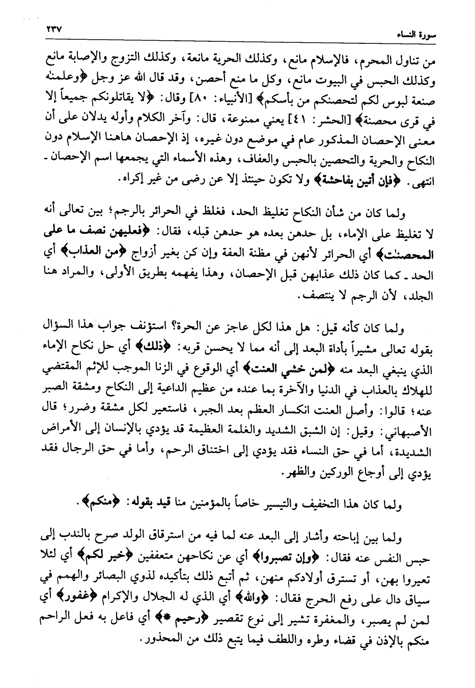 [ الحشر : 41 ] يعني مممنوعة ، قال : وآخر الكلام وأوله يدلان على أن معنى الإحصان المذكور عام في موضع دون يغره ، إذ الإحسان ها هنا الإسلام دون النكاح والحرية والتحصين بالحبس والعفاف ، وهذه الأسماء التي يجمعها اسم الإحصان - انتهى .