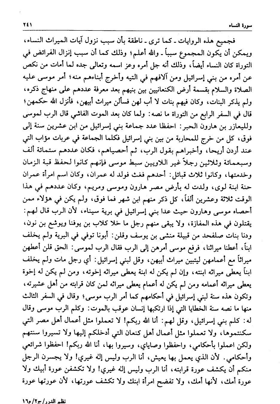 فجميع هذه الروايات - كما ترى - ناطقة بأن سبب نزول آيات الميراث النساء ، ويمكن أن يكون المجموع سبباً - والله أعلم ؛ وذلك كما أن سبب إنزال الفرائض في التوراة كان النساء أيضاً ، وذلك أنه جل أمره وعز اسمه وتعالى جده لما أمات من نكص عن أمره من بني إسرائيل ومن آلافهم في التيه وأخرج أبناءهم منه ؛ أمر موسى عليه الصلاة والسلام بقسمة أرض الكنعانيين بين بنيهم بعد معرفة عددهم على منهاج ذكره ، ولم يذكر البنات ، وكان فيهم بنات لا أب لهن فسالن ميراث أبيهن ، فأنزل الله حكمهن ؛ قال في السفر الرابع من التوراة ما نصه : ولما كان بعد الموت الفاشي قال الرب لموسى ولليعازر بن هارون الحبر : احفظا عدد جماعة بني إسرائيل من ابن عشرين سنة إلى فوق ، كل من خرج للمحاربة من بين بني إسرائيل فكلما الجماعة في عربات مؤاب التي عند أردن أريحا ، وأخبراهم بقول الرب ، ثم أحصياهم ، فكان عددهم ستمائة ألف وسبعمائة وثلاثين رجلاً غير اللاويين سبط موسى فإنهم كانوا لحفظ قبة الزمان وخدمتها ، وكانوا ثلاث قبائل : أحدهم فغث فولد له عمران ، وكان اسم امرأة عمران حنة ابنة لوى ، ولدت له بأرض مصر هارون وموسى ومريم ، وكان عددهم في هذا الوقت ثلاثة وعشرين ألفاً ، كل ذكر منهم ابن شهر فما فوق ، ولم يكن في هؤلاء ممن أحصاه موسى وهارون حيث عدا بني إسرائيل في برية سيناء ، لأن الرب قال لهم : يقتلون في هذه المفازة ، ولا يبقى منهم رجل ما خلا كلاب بن يوفنا ويوشع بن نون ، ودنا بنات صلفحد من قبيلة منشى بن يوسف وقلن : أبونا توفي في البرية ولم يخلف ابناً ، أعطنا ميراثنا ، فرفع موسى أمرهن إلى الرب فقال الرب لموسى : الحق قلن أعطهن ميراثاً مع أعمامه ومن لم يكن له أعمام يعطى ميراثه لمن كان قرابته من أهل عشيرته ، ابناً يعطى ميراثه ابنته ، وإن لم يكن له ابنة يعطى ميراثه إخوته ، ومن لم يكن له إخوة يعطى ميراثه أعمامه ومن لم يكن له أعمام يعطى ميراثه لمن كان قرابته من أهل عشيرته ، وتكون هذه سنة لبني إسرائيل في أحكامهم كما أمر الرب موسى ؛ وقال في السفر الثالث ومنها ما نصه سنة الخطايا التي إذا ارتكبها إنسان عوقب بالموت : وكلم الرب موسى وقال له : كلم بني إسرائيل ، وقل لهم : أنا الله ربكم لا تعملوا مثل أعمالكم أهل مصر التي سكنتموها ، ولا تعملوا مثل أعمال أهل كنعان التي أدخلكم إليها ولا تسيروا سنتهم ولكن اعملوا بأحكامي ، واحفظوا وصاياي ، وسيروا بها ، أنا الله ربكم احفظوا شرائعي وأحكامي .