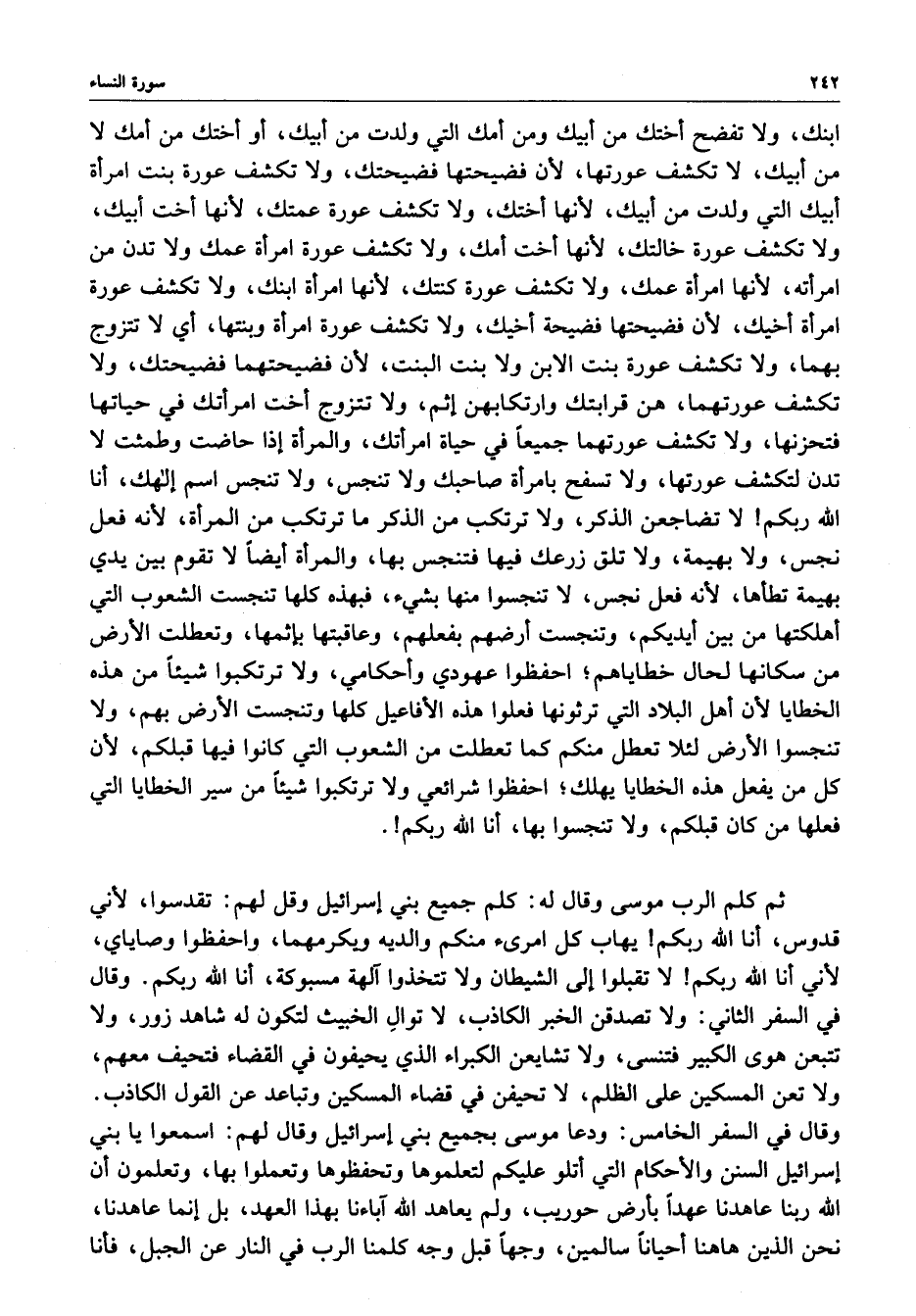 ابنك ، ولا تفضح أختك من أبيك ومن أمك التي ولدت من أبيك ، أو أختك من أمك لا من أبيك ، لا تكشف عورتها ، لأن فضيحتها فضيحتك ، ولا تكشف عورة بنت امرأة أبيك التي ولدت من أبيك ، لأنها أختك ، ولا تكشف عورة امرأة عمك ولا تدن من امرأته ، لأنها امرأة عمك ، ولا تكشف عورة كنتك ، لأنها امرأة ابنك ، ولا تكشف عورة امرأة أخيك ، لأن فضيحتها فضيحة أخيك ، ولا تكشف عورة امرأة وبنتها ، أي لا تتزوج بهما ، ولا تكشف عورة بنت الابن ولا بنت البنت ، لأن فضيحتهما فضيحتك ، ولا تكشف عورتهما ، هن قرابتك وارتكابهن إثم ، ولا تتزوج أخت امرأتك في حياتها فتحزنها ، ولا تكشف عورتهما جميعاً في حياة امرأتك ، والمرأة إذا حاضت وطمثت لا تدن لتكشف عورتها ، ولا تسفح بامرأة صاحبك ولا تنجس ، ولا تنجس اسم إلهك ، أنا الله ربكم لا تضاجعن الذكر ، ولا ترتكب من الذكر ما ترتكب من المرأة ، لا ، ه فعل نجس ، ولا بهيمة ، ولا تلق زرعك فيها فتنجس بها ، والمرأة أيضاً لا تقوم بين يدي بهيمة تطأها ، لأنه فعل نجس ، لا تنجسوا منها بشيء ، فبهذه كلها تنجست الأرض بهم ، ولا تنجسواالأرض لئلا تعطل منكم كما تعطلت من الشعوب التي كانوا يها قبلكم ، لأن كل من يفعل هذه الخطايا يهلك ؛ احفظوا شرائعي ولا ترتكبوا شيئاً من سير الخطايا التي فعلها من كان قبلكم ، ولا تنجسوا بها ، أنا الله ربكم .