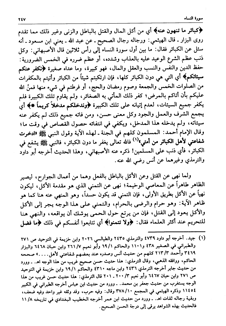 ) كبائر ما تنهون عنه ) أي من أكل المال والقتل بالباطل والزنى وغير ذلك مما تقدم روى البزار - قال الهيثمي : ورجاله رجال الصحيح - عن عبد الله - يعني ابن مسعود - أنه سئل عن الكبائر فقال : ما بين أول سورة النساء إلى رأس ثلاثين قال الأصبهاني : وكل ذنب عظم الشرع الوعيد عليه بالعذاب وشدده ، أو عظم ضرره في الخمس الضرورية : حفظ الدين والنفس والنسب والعقل والمال ، فهو كبيرة ، وما عداه صغيرة ) نكفر عنكم سيئاتكم ) أي التي هي دون الكبائر كلها ، فإن ارتكبتم شيئاً من الكبائر وأتيتم بالمكفرات من الصلوات الخمس والجمعة وصوم رمضان والحج ، أو فرطتم في شي ءمنها فمنَّ الله عليكم بأن أتاكم بالمرض ؛ كفر ذلك المأتي به لاصغائر ، ولم يقاوم تلك الكبيرة فلم يكفر جميع السيئات ، لعدم إتيانه على تلك الكبيرة ) وندخلكم مدخلاً كريماً ) أي يجمع الشرف والعمل والجود وكل معنى حسن ، ومن فاته جميع ذلك لم يكفر عنه سيئاته ، ولم يدخله هذا المدخل ، ويكفي في انتفائه حصول القصاص في وقت ما ؛ وقال الإمام أحمد : المسلمون كلهم في الجنة - لهذه الآية وقول النبي ( صلى الله عليه وسلم ) ( ادخرت شفاعتي لأهل الكبائر من أمتى ) فالله تعالى يغفر ما دون الكبائر ، فالنبي ( صلى الله عليه وسلم ) يشفع في الكبائر ، فأي ذنب على المسلمين ذكره عنه الأصبهاني ، وهذا الحديث أخرجه أبو داود والترمذي وغيرهما عن أنس رضي الله عنه .