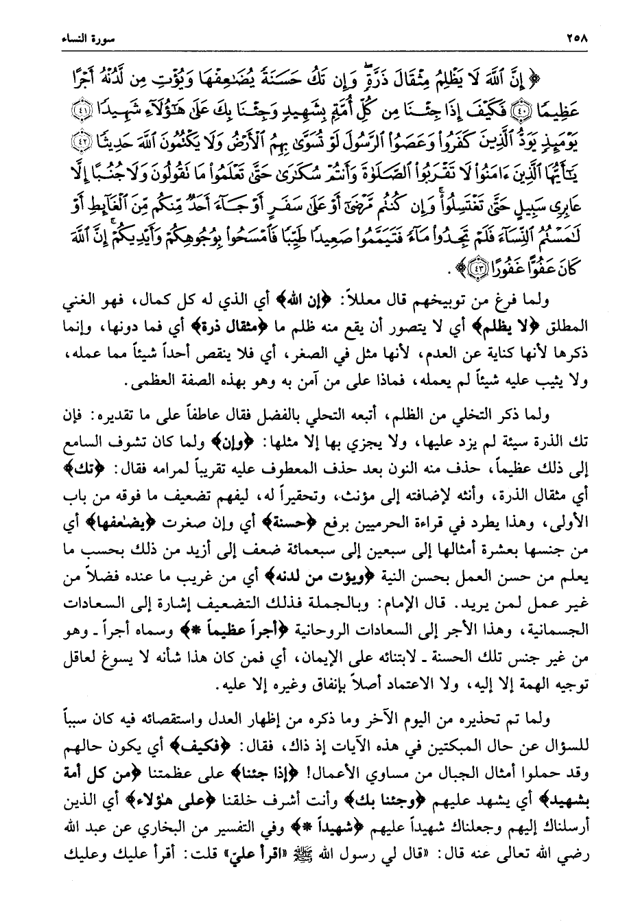 ) إِنَّ اللَّهَ لاَ يَظْلِمُ مِثْقَالَ ذَرَّةٍ وَإِن تَكُ حَسَنَةً يُضَاعِفْهَا وَيُؤْتِ مِن لَّدُنْهُ أَجْراً عَظِيماً فَكَيْفَ إِذَا جِئْنَا مِن كُلِّ أمَّةٍ بِشَهِيدٍ وَجِئْنَا بِكَ عَلَى هَؤُلاءِ شَهِيداً يَوْمَئِذٍ يَوَدُّ الَّذِينَ كَفَرُواْ وَعَصَوُاْ الرَّسُولَ لَوْ تُسَوَّى بِهِمُ الأَرْضُ وَلاَ يَكْتُمُونَ اللَّهَ حَدِيثاً يَاأَيُّهَا الَّذِينَ آمَنُواْ لاَ تَقْرَبُواْ الصَّلاَةَ وَأَنْتُمْ سُكَارَى حَتَّى تَعْلَمُواْ مَا تَقُولُونَ وَلاَ جُنُباً إِلاَّ عَابِرِي سَبِيلٍ حَتَّى تَغْتَسِلُواْ وَإِنْ كُنْتُمْ مَّرْضَى أَوْ عَلَى سَفَرٍ أَوْ جَآءَ أَحَدٌ مِّنْكُمْ مِّن الْغَآئِطِ أَوْ لاَمَسْتُمُ النِّسَآءَ فَلَمْ تَجِدُواْ مَآءً فَتَيَمَّمُواْ صَعِيداً طَيِّباً فَامْسَحُواْ بِوُجُوهِكُمْ وَأَيْدِيَكُمْ إِنَّ اللَّهَ كَانَ عَفُوّاً غَفُوراً ( ( )
