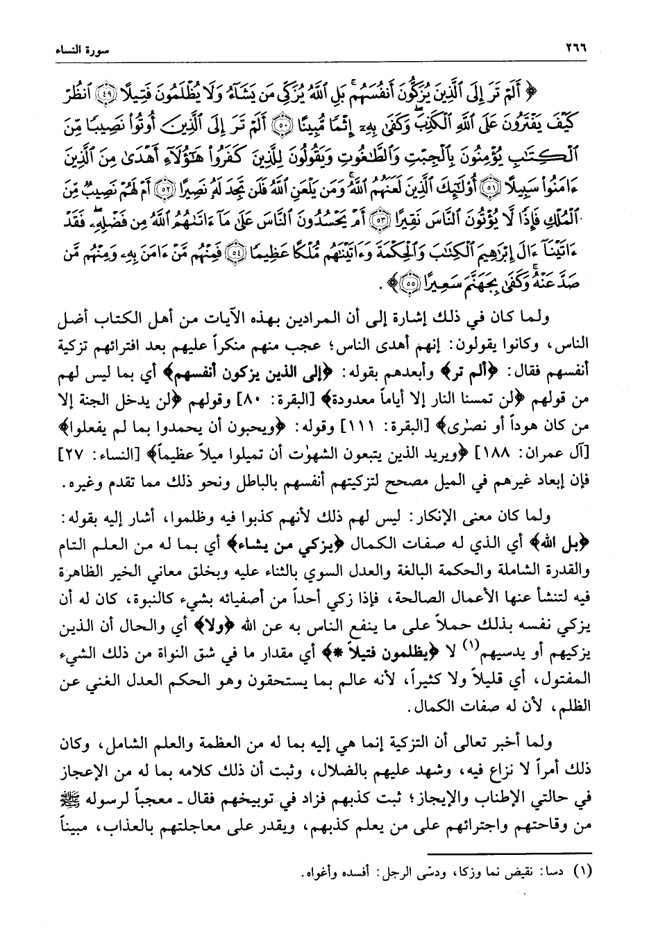 ) أَلَمْ تَرَ إِلَى الَّذِينَ يُزَكُّونَ أَنْفُسَهُمْ بَلِ اللَّهُ يُزَكِّي مَن يَشَآءُ وَلاَ يُظْلَمُونَ فَتِيلاً انظُرْ كَيفَ يَفْتَرُونَ عَلَى اللَّهِ الكَذِبَ وَكَفَى بِهِ إِثْماً مُّبِيناً أَلَمْ تَرَ إِلَى الَّذِينَ أُوتُواْ نَصِيباً مِّنَ الْكِتَابِ يُؤْمِنُونَ بِالْجِبْتِ وَالطَّاغُوتِ وَيَقُولُونَ لِلَّذِينَ كَفَرُواْ هَؤُلاءِ أَهْدَى مِنَ الَّذِينَ آمَنُواْ سَبِيلاً أُوْلَئِكَ الَّذِينَ لَعَنَهُمُ اللَّهُ وَمَن يَلْعَنِ اللَّهُ فَلَن تَجِدَ لَهُ نَصِيراً أَمْ لَهُمْ نَصِيبٌ مِّنَ الْمُلْكِ فَإِذاً لاَّ يُؤْتُونَ النَّاسَ نَقِيراً أَمْ يَحْسُدُونَ النَّاسَ عَلَى مَآ آتَاهُمُ اللَّهُ مِن فَضْلِهِ فَقَدْ آتَيْنَآ آلَ إِبْرَاهِيمَ الْكِتَابَ وَالْحِكْمَةَ وَآتَيْنَاهُمْ مُّلْكاً عَظِيماً فَمِنْهُمْ مَّنْ آمَنَ بِهِ وَمِنْهُمْ مَّن صَدَّ عَنْهُ وَكَفَى بِجَهَنَّمَ سَعِيراً ( ( )