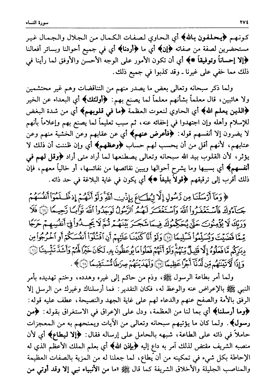) وَمَآ أَرْسَلْنَا مِن رَّسُولٍ أِلاَّ لِيُطَاعَ بِإِذْنِ اللَّهِ وَلَوْ أَنَّهُمْ إِذ ظَّلَمُواْ أَنْفُسَهُمْ جَآءُوكَ فَاسْتَغْفَرُواْ اللَّهَ وَاسْتَغْفَرَ لَهُمُ الرَّسُولُ لَوَجَدُواْ اللَّهَ تَوَّاباً رَّحِيماً فَلاَ وَرَبِّكَ لاَ يُؤْمِنُونَ حَتَّى يُحَكِّمُوكَ فِيمَا شَجَرَ بَيْنَهُمْ ثُمَّ لاَ يَجِدُواْ فِي أَنْفُسِهِمْ حَرَجاً مِّمَّا قَضَيْتَ وَيُسَلِّمُواْ تَسْلِيماً وَلَوْ أَنَّا كَتَبْنَا عَلَيْهِمْ أَنِ اقْتُلُواْ أَنْفُسَكُمْ أَوِ اخْرُجُواْ مِن دِيَارِكُمْ مَّا فَعَلُوهُ إِلاَّ قَلِيلٌ مِّنْهُمْ وَلَوْ أَنَّهُمْ فَعَلُواْ مَا يُوعَظُونَ بِهِ لَكَانَ خَيْراً لَّهُمْ وَأَشَدَّ تَثْبِيتاً وَإِذاً لآتَيْنَاهُمْ مِّن لَّدُنَّآ أَجْراً عَظِيماً وَلَهَدَيْنَاهُمْ صِرَاطاً مُّسْتَقِيماً ( ( )