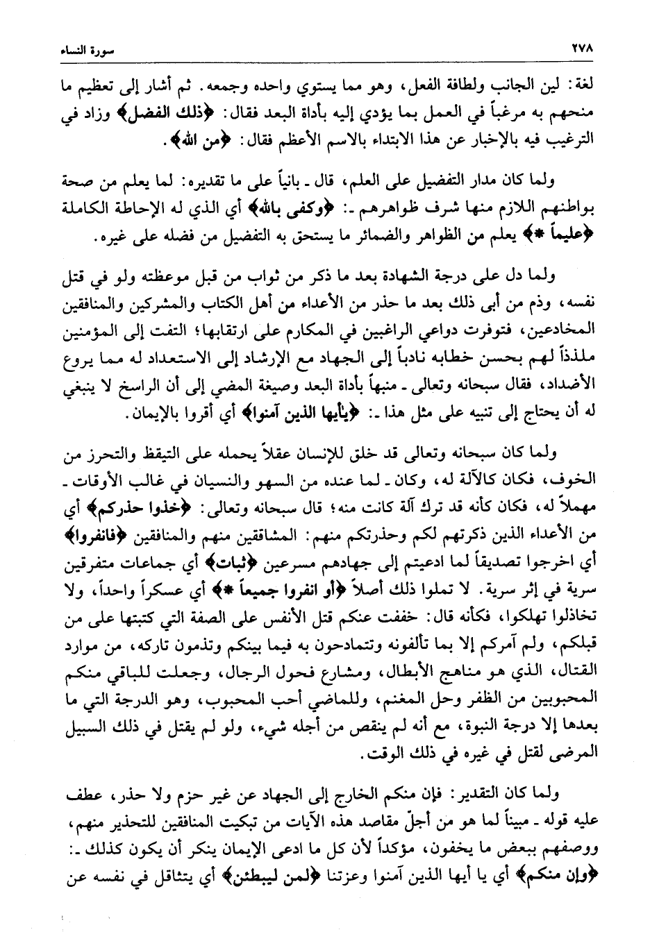 لا تملوا ذلك أصلاً ) أو انفروا جميعاً ) أي عسكراً واحداً ، ولا تخاذلوا تهلكوا ، فكأنه قال : خففت عنكم قتل الأنفس على الصفة التي كتبتها على من قبلكم ، ولم آمركم إلا بما تألفونه وتتمادحون به فيما بينكم وتذمون تاركه ، من موارد القتالن الذي هو مناهج الأبطال ، ومشارع فحول الرجال ، وجعلت للباقي منكم المحبوبين من الظفر وحل المغنم ، وللماضي أحب المحبوب ، وهو الدجرة التي ما بعدها إلا درجة النبوة ، مع أنه لم ينقص من أجله شيء ، ولو لم يقتل في ذلك السبيل المرضى لقتل في غيره في ذلك الوقت .
