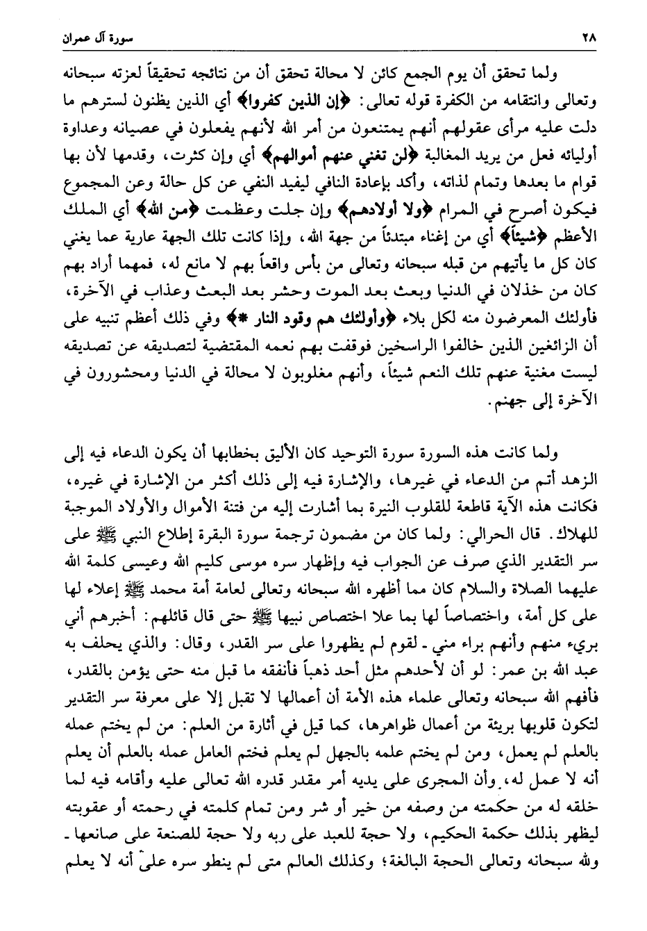 قال الحرالي : ولما كان من مضمون ترجمة سورة البقرة إطلاع النبي على سر التقدير الذي صرف عن الجواب فيه وإظهار سره موسى كليم الله وعيسى كلمة الله عليهما الصلاة والسلام كان مما أظهره الله سبحانه وتعالى لعامة أمة محمد إعلاء لها على كل أمة ، واختصاصاً لها بما علا اختصاص نبيها حتى قال قائلهم : أخبرهم أني بريء منهم وأنهم براء مني لقوم لم يظهروا على سر القدر ، وقال : والذي يحلف به عبد الله بن عمر : لو أن لأحدهم مثل أحد ذهباً فأنفقه ما قبل منه حتى يؤمن بالقدر ، فأفهم الله سبحانه وتعالى علماء هذه الأمة أن أعمالها لا تقبل إلا على معرفة سر التقدير لتكون قلوبها بريئة من أعمال ظواهرها ، كما قيل في أثارة من العلم : من لم يختم عمله بالعلم لم يعمل ، ومن لم يختم علمه بالجهل لم يعلم فختم العامل عمله بالعلم أن يعلم أنه لا عمل له ، وأن المجرى على يديه أمر مقدر قدره الله سبحانه وتعالى عليه وأقامه فيه لما خلقه له من حكمته من وصفه من خير أو شر ومن تمام كلمته في رحمته أو عقوبته ليظهر بذلك حكمة الحكيم ، ولا حجة للعبد على ربه ولا حجة للصنعة على صانعها ولله سبحانه وتعالى الحجة البالغة ؛ وكذلك العالم متى لم ينطو سره على أنه لا يعلم