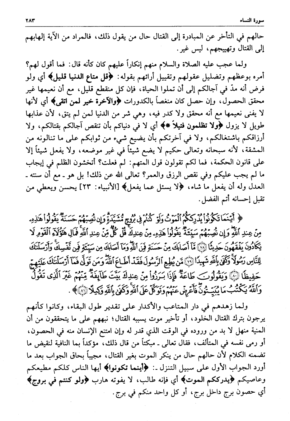 ) أَيْنَمَا تَكُونُواْ يُدْرِككُّمُ الْمَوْتُ وَلَوْ كُنتُمْ فِي بُرُوجٍ مُّشَيَّدَةٍ وَإِن تُصِبْهُمْ حَسَنَةٌ يَقُولُواْ هَذِهِ مِنْ عِندِ اللَّهِ وَإِن تُصِبْهُمْ سَيِّئَةٌ يَقُولُواْ هَذِهِ مِنْ عِندِكَ قُلْ كُلٌّ مِّنْ عِندِ اللَّهِ فَمَا لِهَؤُلاءِ الْقَوْمِ لاَ يَكَادُونَ يَفْقَهُونَ حَدِيثاً مَّآ أَصَابَكَ مِنْ حَسَنَةٍ فَمِنَ اللَّهِ وَمَآ أَصَابَكَ مِن سَيِّئَةٍ فَمِن نَّفْسِكَ وَأَرْسَلْنَاكَ لِلنَّاسِ رَسُولاً وَكَفَى بِاللَّهِ شَهِيداً مَّنْ يُطِعِ الرَّسُولَ فَقَدْ أَطَاعَ اللَّهَ وَمَن تَوَلَّى فَمَآ أَرْسَلْنَاكَ عَلَيْهِمْ حَفِيظاً وَيَقُولُونَ طَاعَةٌ فَإِذَا بَرَزُواْ مِنْ عِندِكَ بَيَّتَ طَآئِفَةٌ مِّنْهُمْ غَيْرَ الَّذِي تَقُولُ وَاللَّهُ يَكْتُبُ مَا يُبَيِّتُونَ فَأَعْرِضْ عَنْهُمْ وَتَوَكَّلْ عَلَى اللَّهِ وَكَفَى بِاللَّهِ وَكِيلاً ( ( )