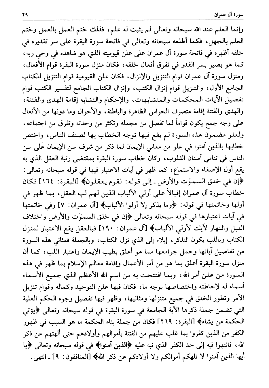 وإنما العلم عند الله سبحانه وتعالى لم يثبت له علم ، فذلك ختم العمل بالعمل وختم العلم بالجهل ، فكما أطلعه سبحانه وتعالى في فاتحة سورة البقرة على سر تقديره في خلقه أظهرهفي فاتحة سورة آل عمران على علن قيوميته الذي هو شاهده في وحي ربه ، كما هو بصير بسر القدر في تفرق أفعال خلقه ، فكان منزل سورة البقرة قوام التنزيل للكتاب الجامع الأول ، والتنزيل قوام إنزال الكتب ، وإنزال الكتاب الجامع لتفسير الكتب قوام تفصيل الآيات المحكمات والمتشابهات ، والإحكام والتشابه إقامة الهدى والفتنة ، والهدى والفتنة إقامة متصرف الحواس الظاهرة والباطنة ، والأحوال وما دونها من الأفعال على وجه جمع يكون قواماً لما تفصل من مجمله وتكثر من وحدته وتفرق من اجتماعه ، ولعلو مضمون هذه السورة لم يقع فيها توجه الخطاب بها لصنف الناس ، واختص خطابها بالذين آمنوا في علو من معاني الإيمان لما ذكر من شرف سن الإيمان على سن الناس في تنامي أسنان القلوب ، وكان خطاب سورة البقرة بمقتضى رتبة العقل الذي به يقع أول الإصغاء والاستماع ، كما ظهر في آيات الاعتبار فيها في قوله سبحانه وتعالى :
