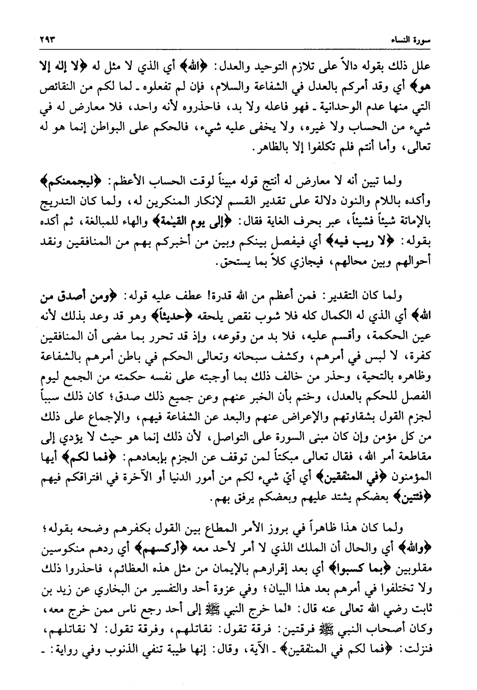 ولما كان التقدير : فمن أعظم من الله قدرة عطف عليه قوله : ( ومن أصدق من الله ) أي الذي له الكمال كله فلا شوب نقص يلحقه ) حديثاً ( وهو قد وعد بذلك لأنه عين الحكمة ، وأقسم عليه ، فلا بد من وقوعه ، وإذ قد تحرر بما مضى أن المنافقين كفرة ، لا لبس في أمرهم ، وكشف سبحانه وتعالى الحكم في باطن أمرهم بالشفاعة وظاهرة بالتحية ، وحذر من خالف ذلك بما أوجبته على نفسه حكمته من الجمع ليوم الفصل للحكم بالعدل ، وختم بأن الخبر عنهم وعن جميع ذلك صدق ؛ كان ذلك سبباً لجزم القول بشقاوتهم والإعراض عنهم والبعد عن الشفاعة فيهم ، والإجماع على ذلك من كل مؤمن وإن كان مبنى السورة على التواصل ، لأن ذلك إنما هو حيث لا يؤدي إلى مقاطعة أمر الله ، فقال تعالى مبكتاً لمن توقف عن الجزم بإبعادهم : ( فما لكم ( أيها المؤمنون ) في المنافقين ) أي أيّ شيء لكم من أمور الدنيا أو الآخرة في افتراقكم فيها ) فئتين ( بعضكم يشتد عليهم وبعضكم يرفق بهم .