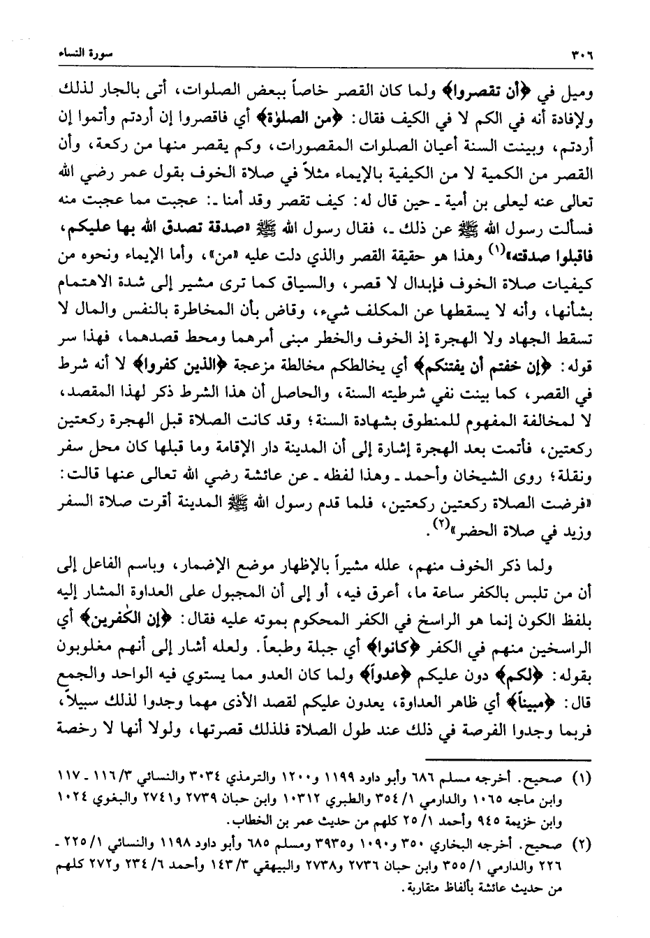 وميل في ) وأن تقصروا ( ولما كان القصر خاصاً ببعض الصلوات ، أتى بالجار لذلك ولإفادة أنه يف الكم لا في الكيف فقال : ( من الصلاة ) أي فاقصروا إن أردتم وأتموا إن أردتم ، وبينت السنة أعيان الصلوات المقصورات ، وكم يقصر منها من ركعة ، وأن القصر من الكمية لا من الكيفية بالإيماء مثلاً في صلاة الخوف بقول عمر رضي الله تعالى عنه ليعلى بن أمية - حين قال له : كيف تقصر وقد أمنا - : عجبت مما عجبت منه فسألت رسول الله ( صلى الله عليه وسلم ) عن ذلك - ، فقال رسول الله ( صلى الله عليه وسلم ) ( صدقة تصدق الله بها عليكم ، فاقبلوا صدقته ) وهذا هو حقيقة القصر والذي دلت عليه ( من ) ، وأما الإيماء ونحوه من كيفيات صلاة الخوف بإبدال لا قصر ، والسياق كام ترى مشير إلى شدة الاهتمام بشأنها ، وأنه لا يسقطها عن المكلف شيء ، وقاض بأن المخاطرة بالنفس والمال لا تسقط الجهاد ولا الهجرة إذ الخوف والخطر مبنى أمرهما ومحط قصدهما ، فهذا سر قوله : ( وإن خفتم أن يفتنكم ) أي يخالطم مخالطة مزعجة ) الذين كفروا ( لا أنه شرط في القصر ، كما بينت نففي شرطيته السنة ، والحاصل أن هذا الشرط ذكر لهذا المقصد ، لا لمخالفة المفهوم للمنطوق بشهادة السنة ؛ وقد كانت الصلاة قبل الهجرة ركعتين ركعتين ، فأتمت بعد الهجرة إشارة إلى أن المدينة دار الإقامة وما قبلها كان محل سفر ونقلة ؛ روى الشيخان وأحمد - وهذا لفظه - عن عائشة رضي الله تعالى عنها قالت : ( فرضت الصلاة ركعتين ركعتين ، فلما قدم رسول الله ( صلى الله عليه وسلم ) المدينة أقرت صلاة لاسفر وزيد فصل صلاة الحضر ) .