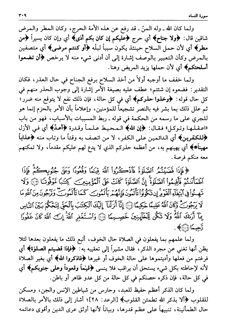 ) فَإِذَا قَضَيْتُمُ الصَّلاَةَ فَاذْكُرُواْ اللَّهَ قِيَاماً وَقُعُوداً وَعَلَى جُنُوبِكُمْ فَإِذَا اطْمَأْنَنتُمْ فَأَقِيمُواْ الصَّلاَةَ إِنَّ الصَّلاَةَ كَانَتْ عَلَى الْمُؤْمِنِينَ كِتَاباً مَّوْقُوتاً وَلاَ تَهِنُواْ فِي ابْتِغَآءِ الْقَوْمِ إِن تَكُونُواْ تَأْلَمُونَ فَإِنَّهُمْ يَأْلَمُونَ كَمَا تَأْلَمونَ وَتَرْجُونَ مِنَ اللَّهِ مَا لاَ يَرْجُونَ وَكَانَ اللَّهُ عَلِيماً حَكِيماً إِنَّآ أَنْزَلْنَا إِلَيْكَ الْكِتَابَ بِالْحَقِّ لِتَحْكُمَ بَيْنَ النَّاسِ بِمَآ أَرَاكَ اللَّهُ وَلاَ تَكُنْ لِّلْخَآئِنِينَ خَصِيماً وَاسْتَغْفِرِ اللَّهِ إِنَّ اللَّهَ كَانَ غَفُوراً رَّحِيماً ( ( )