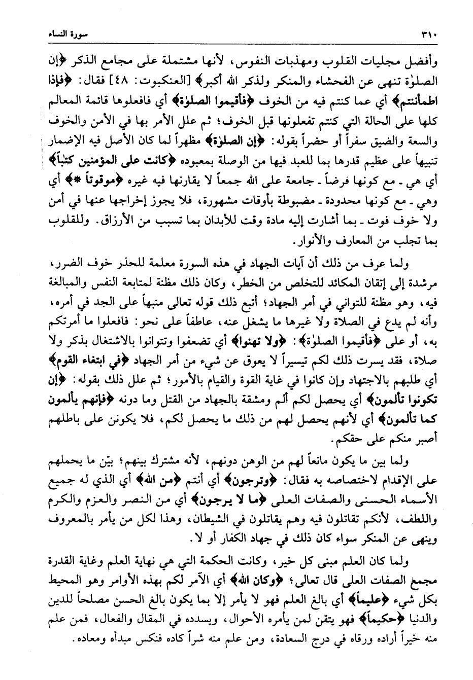 ولما عرف من ذلك أن آيات الجهاد في هذه السورة معلمة للحذر خوف الضرر ، مرشدة إلى إتقان المكائد للتخلص من الخطر ، وكان ذلك نمظنة لمتابعة النفس والمبالغة فيه ، وهو مظنة للتواني في أمر الجهاد ؛ أتبع ذلك قوله تعالى منبهاً على الجد في أمره ، وأنه لم يدع في الصلاة ولا غيرها ما يشغل عنه ، عاطفاً على نحو : فافعلوا ما أمرتكم به ، أو على ) فأقيموا الصلاة ( : ( ولا تهنوا ) أي تضعفوا وتتوانوا بالاشتغال بذكر ولا صلا ، فقد يسرت ذلك لكم تيسيراً لا يعوق عن شيء من أمر الجهاد ) في ابتغاء القوم ) أي طلبهم بالاجتهاد وإن كانوا ي غاية القوم والقيام بالأمور ؛ ثم علل ذلك بقوله : ( إن تكونوا تألمون ) أي يحصل لكم ألم ومشقة بالجهاد من القتل وما دونه ) فإنهم يألمون كما تألمون ) أي لأنهم يحصل لهم من ذلك ما يحصل لكم ، فلا يكونن على باطلهم اصبر منكم على حقكم .