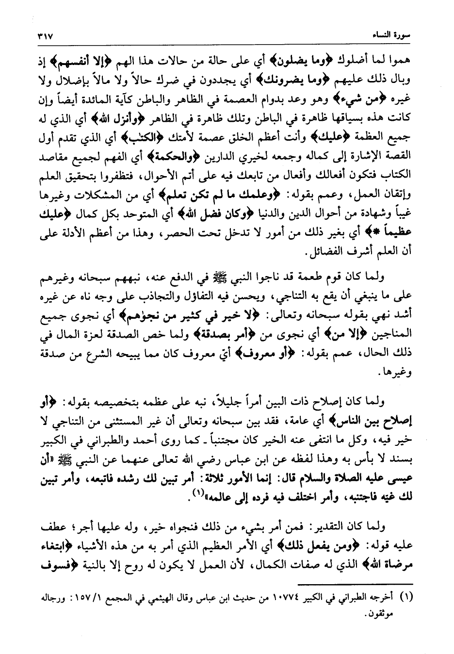 ولما كان إصلاح ذات البين أمراً جليلاً ، نبه على عظمه بتخصيصه بقوله : ( أو إصلاح بين الناس ) أي عامة ، فقد بين سحانه وتعالى أن غير المستثنى من التناجي لا خير فيه ، وكل ما انتقى عنه الخير كان مجتنباً - كما روى أحمد والطبراني في الكبير بسند لا بأس به وهذا لفظه عن ابن عباس رضي الله تعالى عنهما عن النبي ( صلى الله عليه وسلم ) ( أن عيسى عليه الصلاة والسلام قال : إنما الأمور ثلاثة : أمر تبين لك رشده فاتبعه ، وأمر تبين لك غيّه فاجتنبه ، وأمر اختلف فيه فرده إلى عالمه ) .