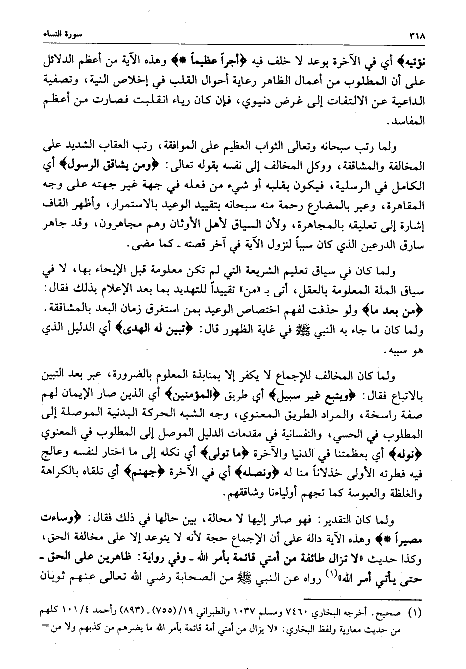 ولما كان التقدير : فهو صائر إليها لا محالة ، بين حالها في ذلك فقال : ( وساءت مصيراً ( وهذه الآية دالة على أن الإجماع حجة لأنه لات يتوعد إلا على مخالفة الحق ، وكذا حديث ( لا تزال طائفة من أمتي قائمة بأمر الله - وفي رواية : ظاهرين على الحق - حتى يأتي أمر الله ) رواه عن النبي ( صلى الله عليه وسلم ) من الصحابة رضي الله تعالى عنهم ثوبان