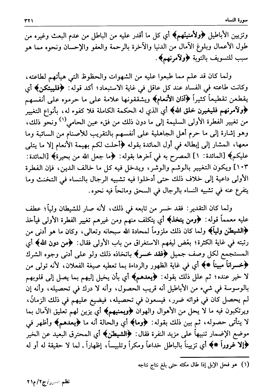 وتزيين الأباطيل ) ولأمنينّهم ) أي كل ما أقدر عليه من الباطل من عدم البعث وغيره من طول الأعمال وبلوغ الآمال من الدنياوالآخرة بالرحمة والعفو والإحسان ونحوه مما هو سبب للتسويف بالتوبة ) ولآمرنهم ( ولما كان قد علم مما طبعوا عليه من الشهوات والحظوظ التي هيأتهم لطاعته ، وكانت طاعته في الفساد عند كل عاقل في غاية الاستبعاد ؛ أكد قوله : ( فليبتكن ) أي يقطعن تقطيعاً كثيراً ) آذان الأنعام ( ويشققونها علامة على ما حرموه على أنفسهم ) ولآمرنهم فليغيرن خلق الله ) أي الذي له الحكمة الكاملة فلا كفوءله ، بأنواع التغيير من تغيير الفطرة الأولى السليمة إلى ما دون ذلك من فقء عين الحامي ونحو ذلك ، وهو إشارة إلى ما حرم أهل الجاهلية على أنفسهم بالتقريب للأصنام من السائبة وما معها ، المشار إلى إبطاله في أول المائدة بقوله
