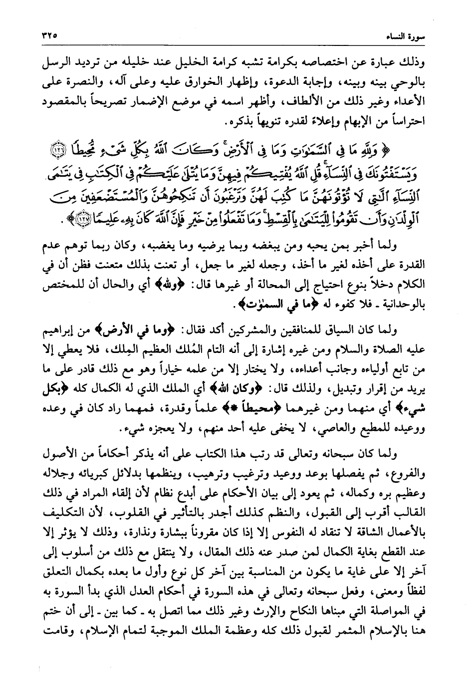 ) وَللَّهِ مَا فِي السَّمَاوَاتِ وَمَا فِي الأَرْضِ وَكَانَ اللَّهُ بِكُلِّ شَيْءٍ مُّحِيطاً وَيَسْتَفْتُونَكَ فِي النِّسَآءِ قُلِ اللَّهُ يُفْتِيكُمْ فِيهِنَّ وَمَا يُتْلَى عَلَيْكُمْ فِي الْكِتَابِ فِي يَتَامَى النِّسَآءِ الَّلاتِي لاَ تُؤْتُونَهُنَّ مَا كُتِبَ لَهُنَّ وَتَرْغَبُونَ أَن تَنكِحُوهُنَّ وَالْمُسْتَضْعَفِينَ مِنَ الْوِلْدَانِ وَأَن تَقُومُواْ لِلْيَتَامَى بِالْقِسْطِ وَمَا تَفْعَلُواْ مِنْ خَيْرٍ فَإِنَّ اللَّهَ كَانَ بِهِ عَلِيماً ( ( )