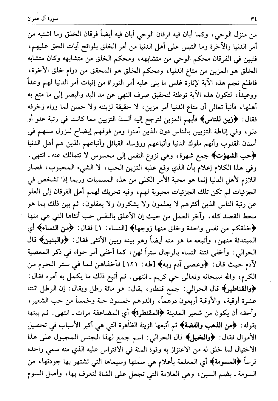 من منزل الوحي ، وكما أبان فيه فرقان الوحي أبان فيه أيضاً فرقان الخلق وما اشتبه من أمر الدنيا والآخرة ووام التبس على أهل الدنيا من أمر الخلق بلوائح آيات الحق عليهم ، فتبين في الفرقان محكم الوحي من متشابهه ، ومحكم الخلق من متشابهه وكان متشابه الخلق هو المزين من متاع الدنيا ، ومحكم الخلق هو المحقق من دوام خلق الآخرة ، فاطلع نجم هذه الآية لإنارة غلس ما بنى عليه أمر التوراة من إثبات أمر الدنيا لهم وعداً ووعيداً ، لتكون هذه الآية تطئة لتحقيق صرف النهي عن مد اليد والبصر إلى ما متع به أهلها ، فأنبأ تعلاى أن متاع الدنيا أمر مزين ، لا حقيقة لزينته ولا حسن لما وراء زخرفة فقال : ( زين للناس ( فأبهم المزين لترجع إليه ألسنة التزيين مما كانت في رتبة علو أو دنو ، وفي إناطة التزيين بالناس دون الذين آمنوا ومن فوقهم إيضاح لنزول سنهم في أسنان القولب وأهم ملوك الدنيا وأتباعهم ورؤساء القبائل وأتباعهم الذين هم أهل الدنياد ) حب الشهوات ( جمع شهوة ، وهي نزوع النفس إلى محسوس لا تتمالك عنه - انتهى .