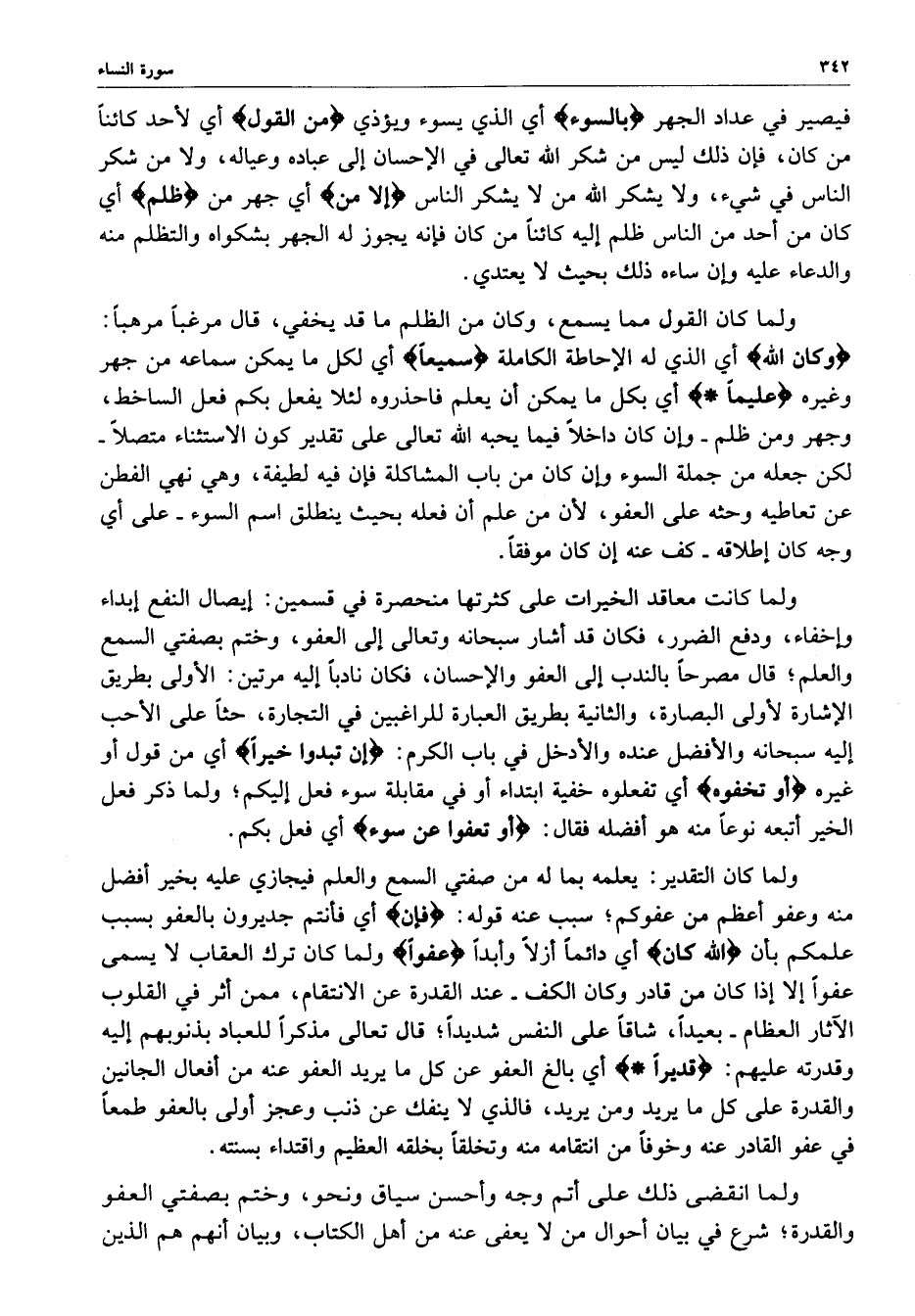 فيصير في عداد الجهر ) بالسوء ) أي الذي يسوء ويؤذي ) من القول ) أي لأحد كائناً من كان ، فإن ذلك ليس من شكر اله من لا يشكر الناس ) إلا من ) أي جهر من ) ظلم ) أي كان من أحد من الناس ظلم إليه كائناً من كان فإنه يجوز له الجهر بشكواه والتظلم منه والدعاء عليه وإن ساءه ذلك بحيث لا يعتدي .