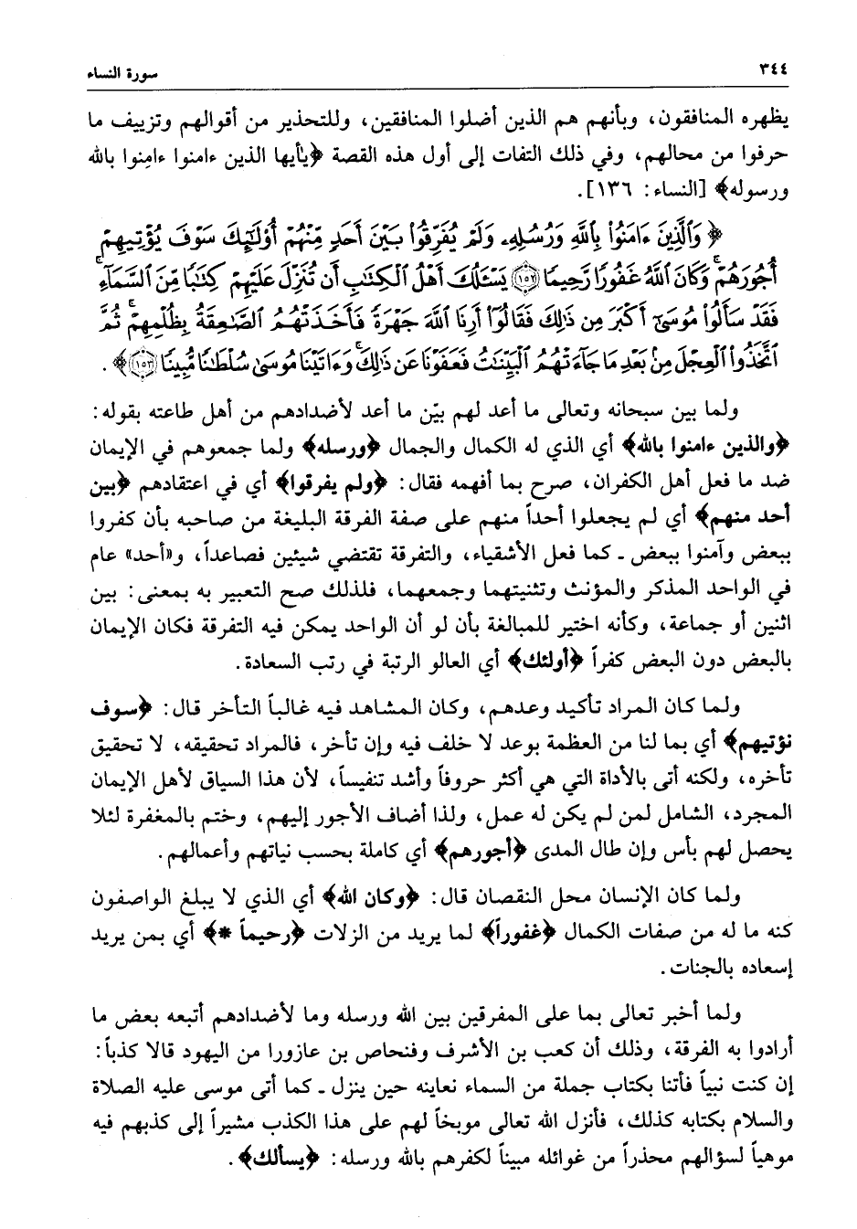 ) وَالَّذِينَ آمَنُواْ بِاللَّهِ وَرُسُلِهِ وَلَمْ يُفَرِّقُواْ بَيْنَ أَحَدٍ مِّنْهُمْ أُوْلَئِكَ سَوْفَ يُؤْتِيهِمْ أُجُورَهُمْ وَكَانَ اللَّهُ غَفُوراً رَّحِيماً يَسْأَلُكَ أَهْلُ الْكِتَابِ أَن تُنَزِّلَ عَلَيْهِمْ كِتَاباً مِّنَ السَّمَآءِ فَقَدْ سَأَلُواْ مُوسَى أَكْبَرَ مِن ذلِكَ فَقَالُواْ أَرِنَا اللَّهِ جَهْرَةً فَأَخَذَتْهُمُ الصَّاعِقَةُ بِظُلْمِهِمْ ثُمَّ اتَّخَذُواْ الْعِجْلَ مِن بَعْدِ مَا جَآءَتْهُمُ الْبَيِّنَاتُ فَعَفَوْنَا عَن ذلِكَ وَآتَيْنَا مُوسَى سُلْطَاناً مُّبِيناً ( ( )