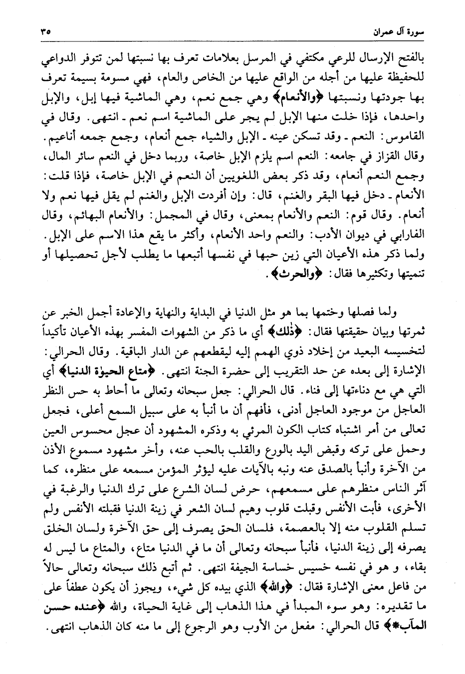 بالفتح الإرسال للرعي مكتفي في المرسل بعلامات تعرف بها نسبتها لمن تتوفر الدواعي للحفيظة عليها من أجله من الواقع عليها منالخاص والعام ، فهي مسومة بسيمة تعرف بها جودتها ونسبتها ) والأنعام ( وهي جمع نعم ، وهي الماشية فيها إبل ، والإبل واحدها ، فإذا خلت مناه الإبل لم يجر على الماشية اسم نعم - انتهى .