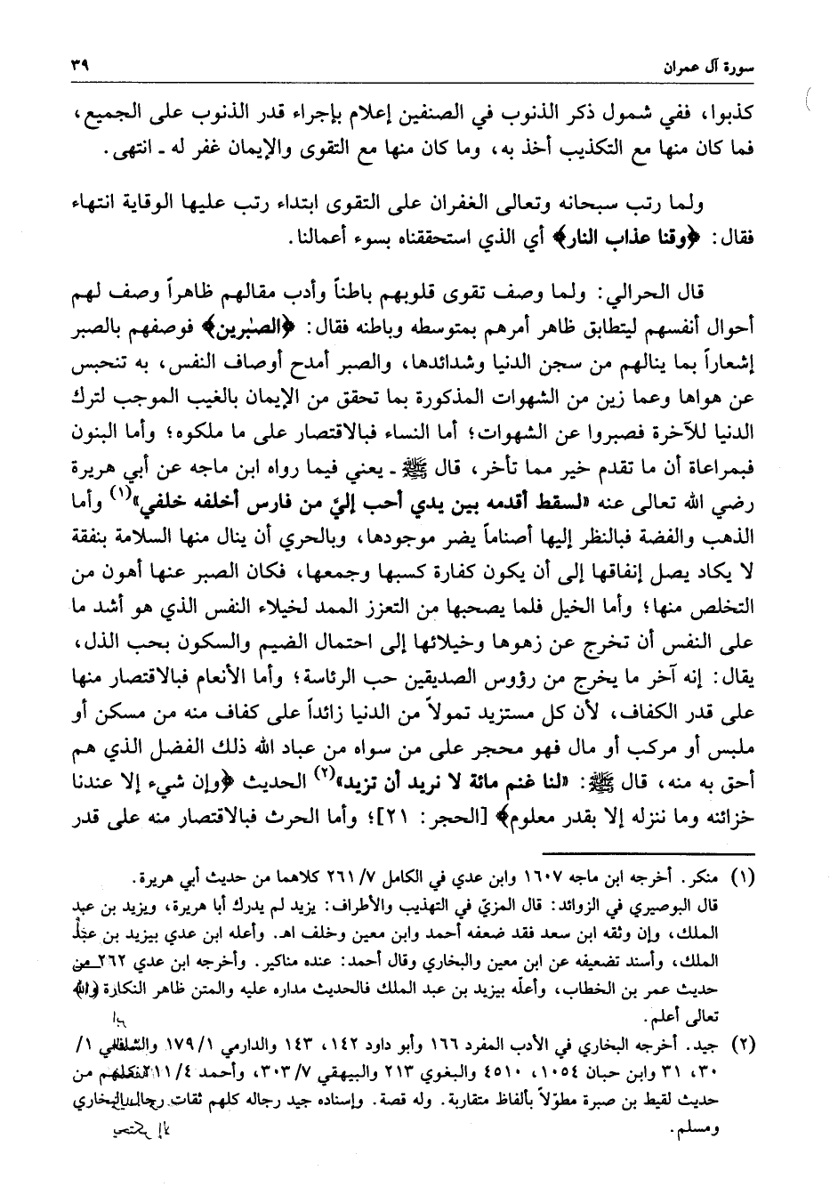 قال الحرالي : ولما وصف تقوى قلوبهم باطناً وأدب مقالهم ظاهراً وصف لهم أحوال أنفسهم ليتطابق ظاهر أمرهم بمتوسطه وباطنه فقال : ( الصابرين ( فوصفهم بالصبر إشعاراً بما ينالهم من سجن الدنيا وشدائدها ، والصبر أمدح أوصفاف النفس ، به تنجس عن هواها وعما زين من الشهوات المذكورة بما تحقق من الإيمان بالغيب الموجب لترك الدنيا للآخرة فصبروا عن الشهوات ؛ أما النساء فبالاقتصار على ما ملكوه وأما البنون فبمراعاة أن ما تقدم خير مما تأخر ، قال ( صلى الله عليه وسلم ) - يعني فيما رواه ابن ماجه عن أبي هريرة رضي الله عنه ( لسقط أقدمه بين يدي أحب إليَّ من فارس أخلفه خلفي ) وأما الذهب والفضة فبالنظر إليها أصناماً يضر موجودها ، وبالحري أن ينال منها السلامة بنفقة لا يكاد يصل إنفاقها إل أن يكون كفارة كسبها وجمعها ، فكان الصبر عنها أهون من التخلص منها ؛ وأما الخيل فلما يصحبها من التعزز الممد لخيلاء النفس الذي هو أشد ما على النفس أن تخرج عن زهوها وخيلائها إلى احتمال الضيم والسكون بحب الذل ، يقال : إنه آخر ما يخرج من رؤوس الصديقين حب الرئاسة ؛ وأما الأنعام فبالاقتصار منها على قدر الكفاف ، لأن كل مستزيد تمولاً من الدنيا زائداً على كفاف منه من مسكن أو ملبس أو مركب أو مال فهو محجر على من سواه من عباد الله ذلك الفضل الذي هم أحق به منه ، قال ( صلى الله عليه وسلم ) : ( لنا غنم مائة لا نريد أن تزيد ) الحديث