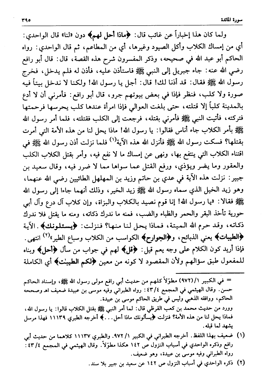 ولما كان هذا إخباراً عن غائب قال : ( ماذا أحل لهم ( دون ) لنا ( قال الواحدي : أي من إمساك الكلاب وأكل الصيود وغيرها ، أي من المطاعم ، ثم قال الواحدي : رواه الحاكم أبو عبد الله في صحيحه ، وذكر المفسرون شرح هذه القصة ، قال : قال أبو رافع رضي الله عنه : جاء جبريل إلى النبي ( صلى الله عليه وسلم ) فاستأذن عليه ، فأذن له فلم يدخلن فخرج رسول الله ( صلى الله عليه وسلم ) فقال : قد أذنا لك قال : أجل يا رسول الله ولكنا لا ندخل بيتاً فيه صورة ولا كلب ، فنظر فإذا في بعض بيوتهم جرو ، قال أبو رافع : فأمرني أن لا أدع بالمدينة كلباً إلا قتلته ، حتى بلغت العوالي فإذا امرأة عندها كلب يحرسها فرحمتها فتركته ، فأتيت النبي ( صلى الله عليه وسلم ) فأمرني بقتله ، فرجعت إلى الكلب فقتلته ، فلما أمر رسول الله ( صلى الله عليه وسلم ) بأمر الكلاب جاء أناس فقالوا : يا رسول الله ماذا يحل لنا نم هذه الأمة التي أمرت بقتلها ؟ فسكت رسول الله ( صلى الله عليه وسلم ) فأنزل الله هذه الآية فلما نزلت أذن رسول الله ( صلى الله عليه وسلم ) في اقتناء الكلاب التي ينتفع بها ، ونهى عن إمساك ما لا نفع فيه ، وأمر بقتل الكلاب الكلب والعقور ما يضر ويؤذي ، ورفع القتل عما سواها مما لا ضر فيه ، وقال سعيد بن جبير : نزلت هذه الآية في عدي بن حاتم وزيد بن المهلهل الطائيين رضي الله عنهما ، وهو زيد الخيل الذي سماه رسول الله ( صلى الله عليه وسلم ) زيد الخير ، وذلك أنهما جاءا إلى رسول الله ( صلى الله عليه وسلم ) فقالا : ( يا رسول الله إنا قوم نصيد بالكلاب والبزاة ، وإن كلاب آل درع وآل أبي حورية تأخذ البقر والحمر والظباء والضب ، فمنه ما ندرك ذكاته ، ومنه ما يقتل فلا ندرك ذكاته ، وقد حرم الله الميتة ، فماذا يحل لنا منها ؟ فنزلت : ( يسئلونك ( الآية ) الطيبات ( يعني الذبائح ، و ) الجوارح ( الكواسب من الكلاب وسباع الطير ( انتهى .