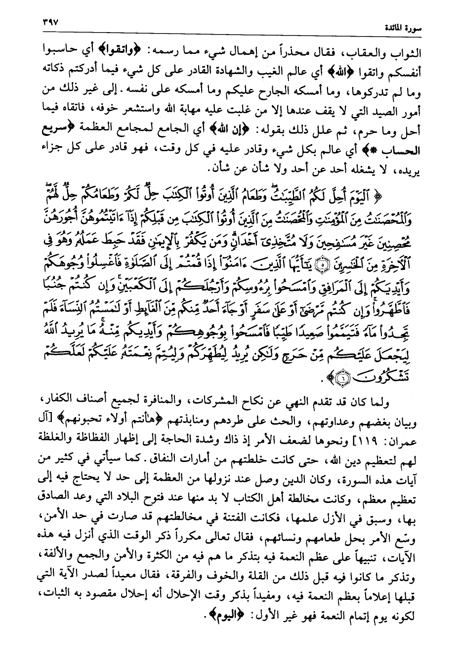 ) الْيَوْمَ أُحِلَّ لَكُمُ الطَّيِّبَاتُ وَطَعَامُ الَّذِينَ أُوتُواْ الْكِتَابَ حِلٌّ لَّكُمْ وَطَعَامُكُمْ حِلٌّ لَّهُمْ وَالْمُحْصَنَاتُ مِنَ الْمُؤْمِنَاتِ وَالْمُحْصَنَاتُ مِنَ الَّذِينَ أُوتُواْ الْكِتَابَ مِن قَبْلِكُمْ إِذَآ آتَيْتُمُوهُنَّ أُجُورَهُنَّ مُحْصِنِينَ غَيْرَ مُسَافِحِينَ وَلاَ مُتَّخِذِي أَخْدَانٍ وَمَن يَكْفُرْ بِالإِيمَانِ فَقَدْ حَبِطَ عَمَلُهُ وَهُوَ فِي الآخِرَةِ مِنَ الْخَاسِرِينَ يَاأَيُّهَا الَّذِينَ آمَنُواْ إِذَا قُمْتُمْ إِلَى الصَّلاةِ فاغْسِلُواْ وُجُوهَكُمْ وَأَيْدِيَكُمْ إِلَى الْمَرَافِقِ وَامْسَحُواْ بِرُؤُوسِكُمْ وَأَرْجُلَكُمْ إِلَى الْكَعْبَينِ وَإِن كُنتُمْ جُنُباً فَاطَّهَّرُواْ وَإِن كُنتُم مَّرْضَى أَوْ عَلَى سَفَرٍ أَوْ جَآءَ أَحَدٌ مِّنْكُمْ مِّنَ الْغَائِطِ أَوْ لاَمَسْتُمُ النِّسَآءَ فَلَمْ تَجِدُواْ مَآءً فَتَيَمَّمُواْ صَعِيداً طَيِّباً فَامْسَحُواْ بِوُجُوهِكُمْ وَأَيْدِيكُمْ مِّنْهُ مَا يُرِيدُ اللَّهُ لِيَجْعَلَ عَلَيْكُم مِّنْ حَرَجٍ وَلَكِن يُرِيدُ لِيُطَهِّرَكُمْ وَلِيُتِمَّ نِعْمَتَهُ عَلَيْكُمْ لَعَلَّكُمْ تَشْكُرُونَ ( ( )
