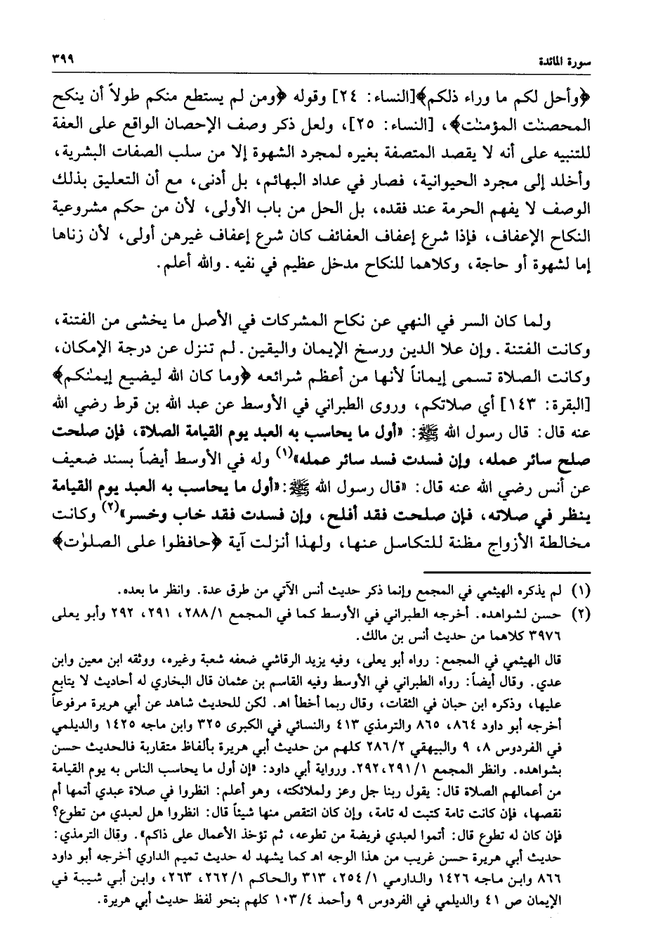 [ البقرة : 143 ] أي صلاتكم ، وروى الطبراني في الأوسط عن عبد الله بن قرط رضي الله عنه قال : قال رسول الله ( صلى الله عليه وسلم ) : ( أول ما يحاسب به العبد يوم القيامة الصلاة ، فإن صلحت صلح سائر عمله ، وإن فسدت فسد سائر عمله ) وله في الأوسط أيضاً بسند ضعيف عن أنس رضي الله عنه قال : ( قال رسول الله ( صلى الله عليه وسلم ) ) أول ما يحاسب به العبد يوم القيامة ينظر في صلاته ، فإن صلحت فقد أفلح ، وإن فسدت فقد خاب وخسر ( وكانت مخالطة الأزواج مظنة للتكاسل عنها ، ولهذا أنزلت آية