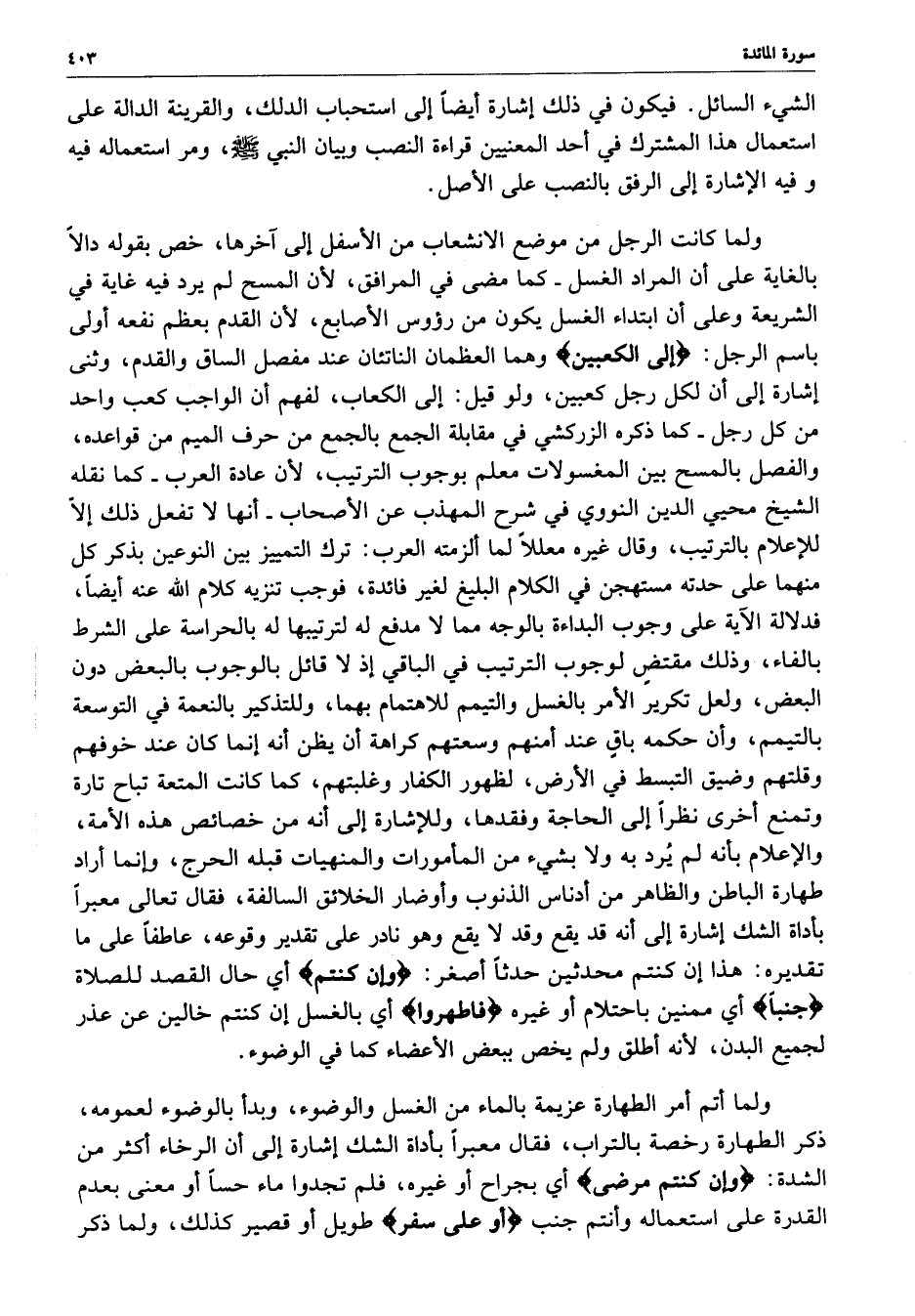 ولما كانت الرجل من موضع الانشعاب من الأسفل إلى آخرها ، خص بقوله دالاً بالغاية على أن المراد الغسل - كما مضى في المرافق ، لأن المسح لم يرد فيه غاية في الشريعة وعلى أن ابتداء الغسل يكون من رؤوس الأسابع ، لأن القدم بعظم نفعه أولى باسم الرجل : ( إلى الكعبين ( وهما العظمان الناتئان عند مفصل الساق والقدم ، وثنى إشارة إلى أن لكل رجل كعبين ، ولو قيل : إلى الكعاب ، لفهم أن الواجب كعب واحد من كل رجل - كما ذكره الزركشي في مقابلة الجمع بالجمع من حرف الميم من قواعده ، والفصل بالمسح بين المغسولات معلم بوجوب الترتيب ، لأن عادة العرب - كما نقله الشيخ محيي الدين النووي في شرح المهذب عن الأصحاب - أنها لا تفعل ذلك إلاّ للإعلام بالترتيب ، وقال غيره معللاً لما ألزمته العرب : ترك التمييز بين النوعين بذكر كل منهما على حدته مستهجن في الكلام البليغ لغير فائدة ، فوجب تنزيه كلام الله عنه أيضاً ، فدلالة الآية على وجوب البداءة بالوجه مما لا مدفع له لترتيبها له بالحراسة على الشرط بالفاء ، وذلك مقتضٍ لوجوب الترتيب في الباقي إذ لا قائل بالوجوب بالبعض دون البعض ، ولعل تكرير الأمر بالغسل والتيمم للاهتمام بهما ، وللتذكير بالنعمة في التوسعة بالتيمم ، وأن حكمه باقٍ عند أمنهم وسعتهم كراهة أن يظن أنه إنما كان عند خوفهم وقلتهم وضيق التبسط في الأرض ، لظهور الكافر وغلبتهم ، كما كان المتعة تباح تارة وتمنع أخرى نظراً إلى الحاجة وفقدها ، وللإشارة إلى أنه من خصائص هذه الأمة ، والإعلام بأنه لم يُرد به ولا بشيء من المأمورات والمنهيات قبله الحرج ، وإنما أراد طهارة الباطن والظاهر من أدناس الذنوب وأوضار الخلائق السالفة ، فقال تعالى معبراً بأداة الشك إشارة إلى أنه قد يقع وقد لا يقع وهو نادر على تقدير وقوعه ، عاطفاً على ما تقديره : هذا إن كنتم محدثين حدثاً أصغر : ( وإن كنتم ) أي حال القصد للصلاة ) جنباً ) أي منين باحتلام أو غيره ) فاطهروا ) أي بالغسل إن كنتم خالين عن عذر لجميع البدن ، لأنه أطلق ولم يخص ببعض الأعضاء كما في الوضوء .