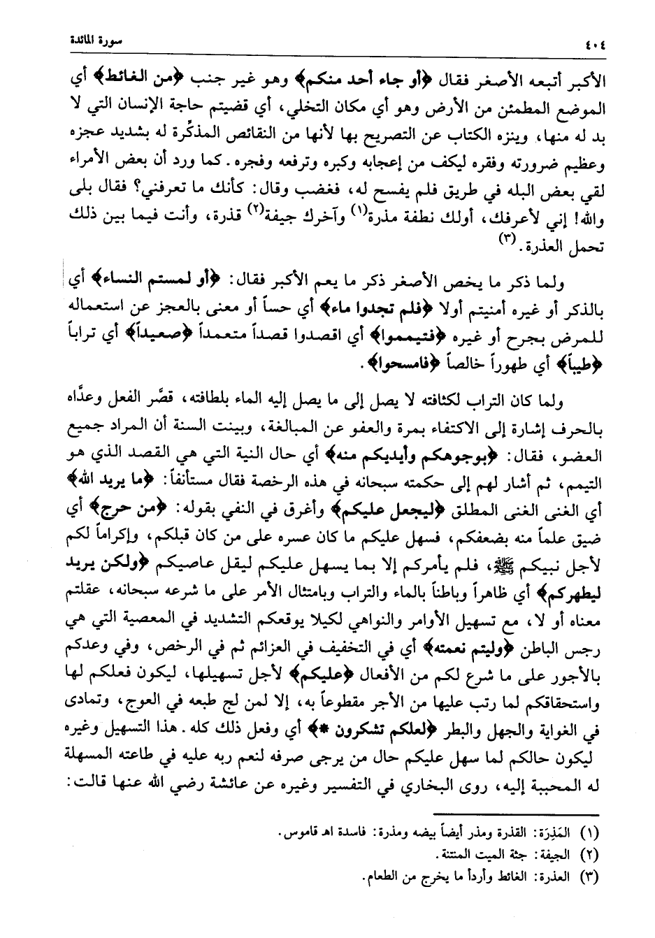 ولما ذكر ما يخص الأصغر ذكر ما يعم الأكبر فقال : ( أو لمستم النساء ) أي بالذكر أو غيره أمنيتم أولا ) فلم تجدوا ماء ) أي حساً أو معنى بالعجز عن استعماله للمرض بجرح أو غيره ) فتيمموا ) أي اقصدوا قصداً متعمداً ) صعيداً ) أي تراباً ) طيباً ) أي طهوراً خالصاً ) فامسحوا ( ولما كان التراب لكثافته لا يصل إلى ما يصل إليه الماء بلطافته ، قصَّر الفعل وعدَّاه بالحرف إشارة إلى الاكتفاء بمرة والعفو عن المبالغة ، وبينت السنة أن المراد جميع العضو ، فقال : ( بوجوهكم وأيديكم منه ) أي حال النية التي هي القصد الذي هو التيمم ، ثم أشار لهم إلى حكمته سبحانه في هذه الرخصة فقال مستأنفاً : ( ما يريد الله ) أي الغنى الغنى المطلق ) ليجعل عليكم ( وأغرق في النفي بقوله : ( من حرج ) أي ضيق علماً منه بضعفكم ، فسهل عليكم ما كان عسرة على من كان قبلكم ، وإكراماً لكم لأجل نبيكم ( صلى الله عليه وسلم ) ، فلم يأمركم إلا بما يسهل عليكم ليقل عاصيكم ) ولكن يريد ليطهركم ) أي ظاهراً وباطناً بالماء والتراب وامتثال الأمر على ما شرعه سبحانه ، عقلتم معناه أو لا ، مع تسهيل الأوامر والنواهي لكيلا يوقعكم التشديد في المعصية التي هي رجس الباطن ) وليتم نعمته ) أي في التخفيف في العزائم ثم في الرخص ، وفي وعدكم بالأجور على ما شرع لكم من الأفعال ) عليكم ( لأجل تسهيلها ، ليكون فعلكم لها واستحقاقكم لما رتب عليها من الأجر مقطوعاً به ، إلا لمن لج طبعه في العوج ، وتمادى في الغواية والجهل والبطر ) لعلكم تشكرون ) أي وفعل ذلك كله .