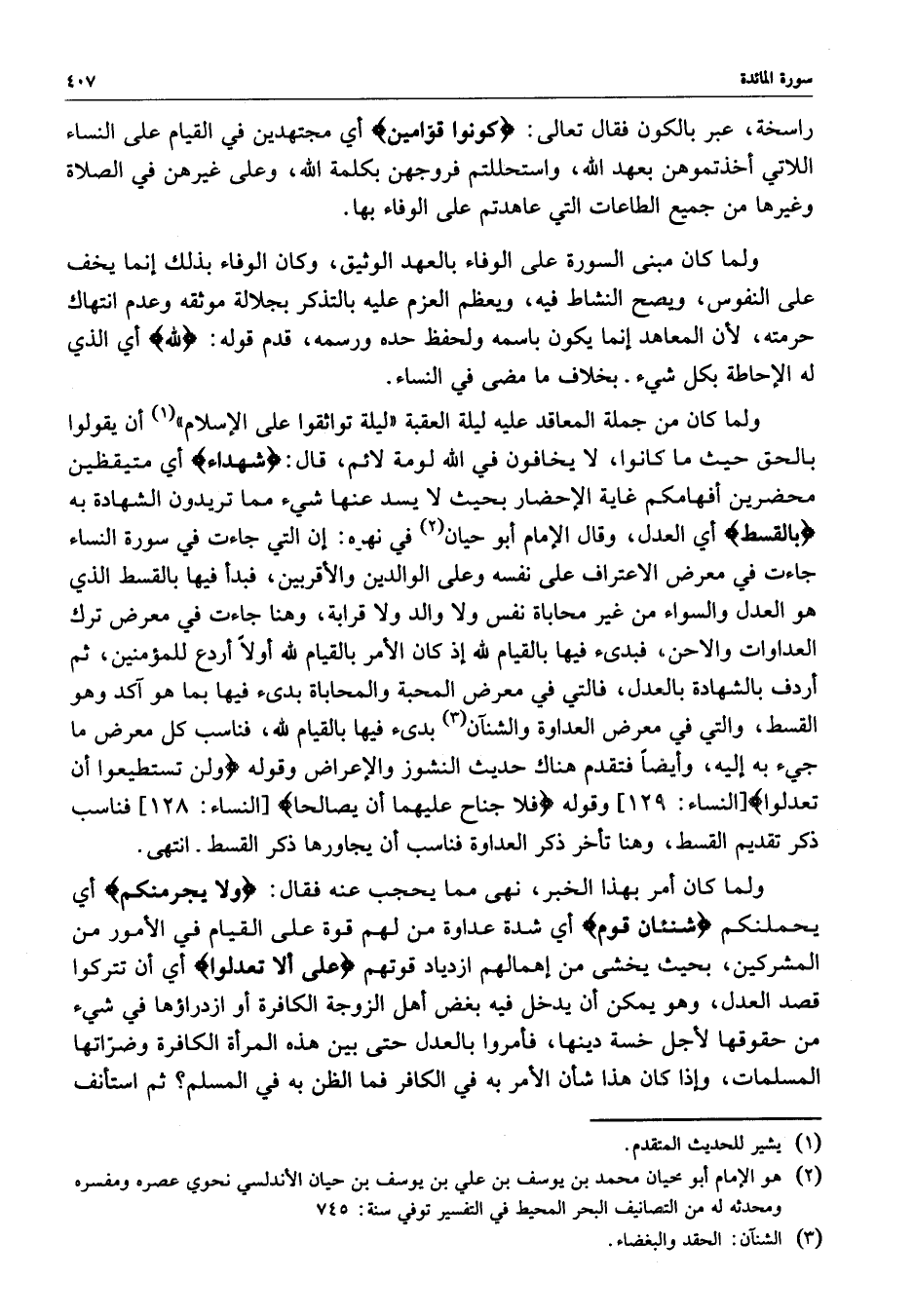 ولما كان من جملة المعاقد عليه ليلة العقبة ( ليلة تواثقوا على الإسلام ) أن يقولوا الحق حيث ما كانوا ، لا يخافون في الله لومة لائم ، قال : ( شهداء ) أي متيقظين محضرين أفهامكم غاية الإحضار بحيث لا يسد عنها شيء مما تريدون الشهادة به ) بالقسط ) أي العدل ، وقال الإمام أبو حيان في نهره : إن التي جاءت ي سورة النساء جاءت في معرض الاعتراف على نفسه وعلى الوالدين والأقربين ، فبدأ فيها باقسط الذي هو العدل ولاسواء من غير محاباة نفس ولا والد ولا قرابة ، وهنا جاءت في معرض ترك العداوات والاحن ، فبدىء فيها بالقيام بله إذ كان الأمر بالقيام لله أولاً أردع للمؤمنين ، ثم أردف بالشهادة بالعدل ، فالتي يف معرض المحبة والمحاباة بدىء فيها بما هو آكد وهو القسط ، والتي في معرض العدواة والشنآن ، بدىء فيها بالقيام لله ، فناسب كل معرض ما جيء به إليه ، وأيضاُ فتقدم هناك حديث النشوز والإعراض وقوله