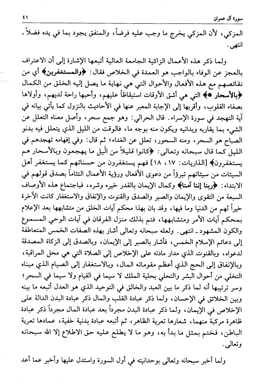 [ الذاريات : 17 ، 18 ] فهم يستغفرون من حسناتهم كما يستغفر أهل السيئات من سيئاتهم تبرؤاً من دعوى الأفعال ورؤية الأعمال التئاماً بصدق قولهم في الابتداء : ( ربنا إننا آمنا ( وكمال الإيمان بالقدر خيره وشره ، فباجتماع هذه الأوصاف السبعة من التقوى والإيمان والصبر والصدق والقنوت والإنفاق والاستغفار كانت الآخرة خيراً لهم من الدنيا وما فيها ، وقد بان بهذا محكم آيات الخلق من متشابهها بعد الإعلام بمحكم آيات الأمر ومتشابهها ، فبتم بذلك منزل الفرقان في آيات الوحي المسموع والكون المشهود - انتهى .