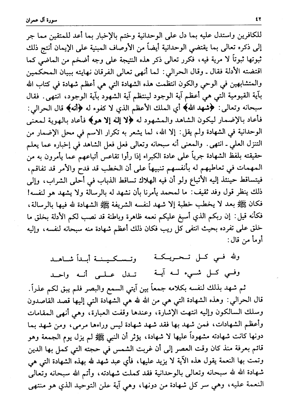 قال الحرالي : وهذه الشهادة التي هي من الله لله هي الشهادة التي إليها قصد القاصدون وسلك السالكون وإليه انتهت الإشارة ، وعندها وقفت العبارة ، وهي أنهى المقامات وأعظم الشهادات ، فمن شهد بها فقد شهد شهادة ليس وراءها مرمى ، ومن شهد بما دونها كانت شهادته مشهوداً عليها لا شهادة ، يؤثر أن النبي ( صلى الله عليه وسلم ) لم يزل يوم الجمعة وهو قائم بعرفة منذ كان وقت العصر إلى أن غربت الشمس في حجته التي كمل بها الدين وتمت بها النعمة يقول هذه الآية لا يزيد عليها ، فأي عبد شهد لله بهذه الشهادة التي هي شهادة الله لله سبحانه وتعالى بالوحدانية فقد كملت شهادته ، وأتم الله سبحانه وتعالى النعمة عليه ، وهي سر كل شهادة من دونها ، وهي آية علن التوحيد الذي هو منتهى