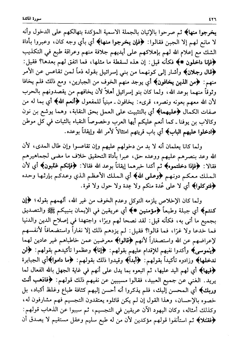 يخرجوا منها ( ثم صرحوا بالإتيان بالجملة الاسمية المؤكدة بتهالكهم على الدخول وأنه لا مانع لهم إلا الجبن فقالوا : ( فإن يخرجوا منها ) أي بأي وجه كان ، وعبروا بأداة الشك مع إعلام الله لهم بإهلاكهم على أيديهم جلافة منهم وعراقة طبع في التكذيب ) فإنا داخلوا ( فكأنه قيل : إن هذه لسقطة ما مثلها ، فما اتفق لهم بعدها ؟ فقيل : ( قال رجلان ( وأشار إلى كونهما من بني إسرائيل بقوله ذماً لمن تقاعس عن الأمر منهم : ( من الذين يخافون ) أي يوجد منهم الخوف من الجبارين ، ومع ذلك فلم يخافا وثوقاً منهما بوعد الله ، ولما كان بنو إسرائيل أهلاً لأن يخافهم من يقصدونهم بالحرب لأن الله معهم بعونه ونصره ، قرىء : يخافون - مبيناً للمفعول ) أنعم الله ) أي بما له من صفات الكمال ) عليهما ) أي بالثبيت على العمل بحق النقابة ، وهما يوشع بن نون وكالاب بن يوفنا - كما أنعم عليكم أيها العرب وخصوصاً النقباء بالثبات في كل موطن ) ادخلوا عليهم الباب ) أي باب قريتهم امتثالاً لأمر الله وإيقاناً بوعده .