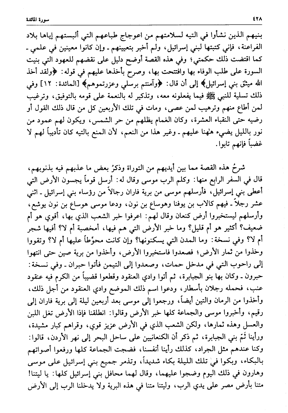شرحُ هذه القصة ما بين أيديهم من التوراة وذكرُ بعض ما عذبهم فيه بذنوبهم ، قال في السفر الرابع منها : وكلم الرب موسى وقال له : أرسل قوماً يجسون الأرض التي أعطى بني إسرائيل ، فأرسلهم موسى من برية فاران رجالاً من رؤساء بني إسرائيل - اثني عشر رجلاً - فيهم كالاب بن يوفنا وهو ساع بن نون ، ودعا موسى هوساع بن نون يوشع ، وأرسلهم ليستخبروا أرض كنعان وقال لهم : اعرفوا خبر الشعب الذي بها ، أقوي هو أم ضعيف ؟ أكثير هو أم قليل ؟ وما خبر الأرض التي هم فيها ، أمخصبة أم لا ؟ أفيها شجر أم لا ؟ وفي نسخة : وما المدن التي يسكنونها ؟ وإن كانت محوَّطاً عليها أم لا ؟ وتقووا وخذوا من ثمار الأرض ؛ فصعدوا فاستخبروا الأرض ، وأخذوا من برية صين حتى انتهوا إلى راحوب التي في مدخل حمات ، وصعدوا إلى التيمن فأتوا حبران - وفي نسخة : حبرون - وكان بها بنو الجبابرة ، ثم أتوا وادي العنقود وقطعوا قضيباً من الكرم فيه عنقود عنب ، فحمله رجلان بأسطار ، ودعوا اسم ذلك الموضع وادي العنقود من أجل ذلك ، وأخذوا من الرمان والتين أيضاً ، ورجعوا إلى موسى بعد أربعين ليلة إلى برية فاران إلى رقيم ، وأخبروا موسى والجماعة كلها خبر الأرض وقالوا : انطلقنا فإذا الأرض تغل اللبن والعسل وهذه ثمارها ، ولكن الشعب الذي في الأرض عزيز قوي ، وقراهم كبار مشيدة ، ورأينا ثَمّ بني الجبابرة ، ثم ذكر أن الكنعانيين على ساحل البحر إلى نهر الأردن ، قالوا : وكنا عندهم مثل الجراد ، كذلك رأينا أنفسنا ، فضجت الجماعة كلها ورفعوا أصواتهم بالبكاء ، وبكوا في تلك الليلة بكاء شديداً ، وتذمر جميع بني إسرائيل على موسى وهارون في ذلك اليوم وضجوا عليهما ، وقال لهما محافل بني إسرائيل كلها : يا ليتنا متنا بأرض مصر على يدي الرب ، وليتنا متنا في هذه البرية ولا يدخلنا الرب إلى الإرض