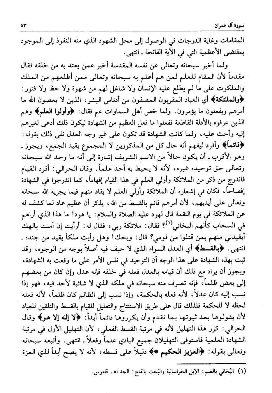 وقال الحرالي : أفرد القيام فاندرج من ذكر من الملائكة وأولي العلم في هذا القيام إفهاماً ، كما اندرجوا في الشهادة إفصاحاً ، فكان في إشعاره أن الملائكة وأولي العلم لا يقاد منهم فيما يجريه الله سبحانه وتعالى على أيديهم ، لأن أمرهم قائم باقسط من الله ، يذكر أن عظيم عاد لما كشف له عن الملائكة في قوم النقمة قال لهود عليه الصلاة والسلام : يا هود ما هذا الذي أراهم في السحاب كأنهم البخاتي ؟ فقال : ملائكة ربي ، فقال له : أرأيت إن آمنت بالهك أيقيدني منهم بمن قتلوا من قومي ؟ قال : ويحك وهل رأيت ملكاً يقيد من جنده - انتهى .