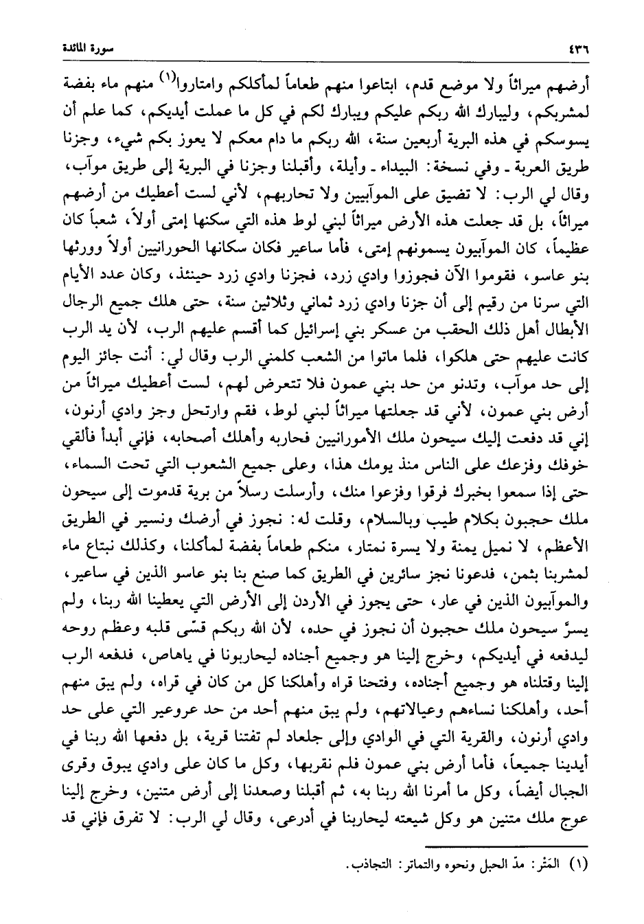 ارضهم ميراثاً ولا موضع قدم ، ابتاعوا منهم طعاماً لمأكلكم وامتاروا منهم ماء بفضة لمشربكم ، وليبارك الله ربكم عليكم ويبارك لكم في كل ما عملت أيديكم ، كما علم أن يسوسكم في هذه البرية أربعين سنة ، الله ربكم ما دام معكم لا يعوز بكم شيء ، وجزنا طريق العربة - وفي نسخته : البيداء - وأيلة ، وأقبلنا وجزنا في البرية إلى طريق موآب ، وقال لي الرب : لا تضيق على الموآبيين ولا تحاربهم ، لأني لست أعطيك من أرضهم ميراثاً ، بل قد جعلت هذه الأرض ميراثاً لبني لوط هذه التي سكنها إمتى أولاً ، شعباً كان عظيماً ، كان الموآبيون يسمونهم إمتى ، فأما ساعير فكان سكانها الحورانيين أولاً وورثها بنو عاسو ، فقوموا الآن فجوزوا وادي زرد ، فجزنا وادي زرد حينئذ ، وكان عدد الأيام التي سرنا من رقيم إلى أن جزنا وادي زرد ثماني وثلاثين سنة ، حتى هلك جميع الرجال الأبطال أهل ذلك الحقب من عسكر بني إسرائيل كما أقسم عليهم الرب ، لأن يد الرب كانت عليهم حتى هلكوا ، فلما ماتوا من الشعب كلمني الرب وقال لي : أنت جائز اليوم إلى حد موآب ، وتدنو من حد بني عمون فلا تتعرض لهم ، لست أعطيك ميراثاً من أرض بني عمون ، لأني قد جعلتها ميراثاً لبني لوط ، فقم وارتحل وجز وادي أرنون ، إني قد دفعت إليك سيحون ملك الأمورانيين فحاربه وأهلك أصحابه ، فإني أبدأ فألقي خوفك وفزعك على الناس منذ يومك هذا ، وعلى جميع الشعوب التي تحت السماء ، حتى إذا سمعوا بخبرك فرقوا وفزعوا منك ، وأرسلت رسلاً من برية قدموت إلى سيحون ملك حجبون بكلام طيب وبالسلام ، وقلت له : نجوز في أرضك ونسير في الطريق الأعظم ، لا نميل يمنة ولا يسرة نمتارن منكم طعاماً بفضة لمأكلنا ، وكذلك نبتاع ماء لمشربنا بثمن ، فدعونا نجز سائرين في الطريق كما صنع بنا بنو عاسو الذي في ساعير ، والموآبيون الذي في عار ، حتى يجوز في الأردن إلى الأرض التي يعطينا الله ربنا ، لوم يسرَّ سيحون ملك حجبون أن نجوز في حده ، لأن الله ربكم قسّى قلبه وعظم روحه ليدفعه في أيديكم ، وخرج إلينا هو وجيمع أجناده ليحاربونا في ياهاص ، فدفعه الرب إلينا وقتلناه هو وجميع أجناده وفتحنا قراه وأهلكنا كل من كان في قراه ، ولم يبق منهم أحد ، وأهلكنا نساءهم وعيالاتهم ، ولم يبق منهم أحد م نحد عروعير التي على حد وادي أرنون ، والقرية التي في الوادي وإلى جلعاد لم تفتنا قرية ، بل دفعها الله ربنا في أيدينا جميعاً ، فأما أرض بني عمون فلم نقربها ، وكل ما كان على وادي يبوق وقرى الجبال أيضاً ، وكل ما أمرنا الله ربنا به ، ثم أقبلنا وصعدنا إلى أرض متنين ، وخرج إلينا عوج ملك متنين هو وكل شيعته ليحاربنا في أدرعى ، وقال لي الرب : لا تفرق فإني قد