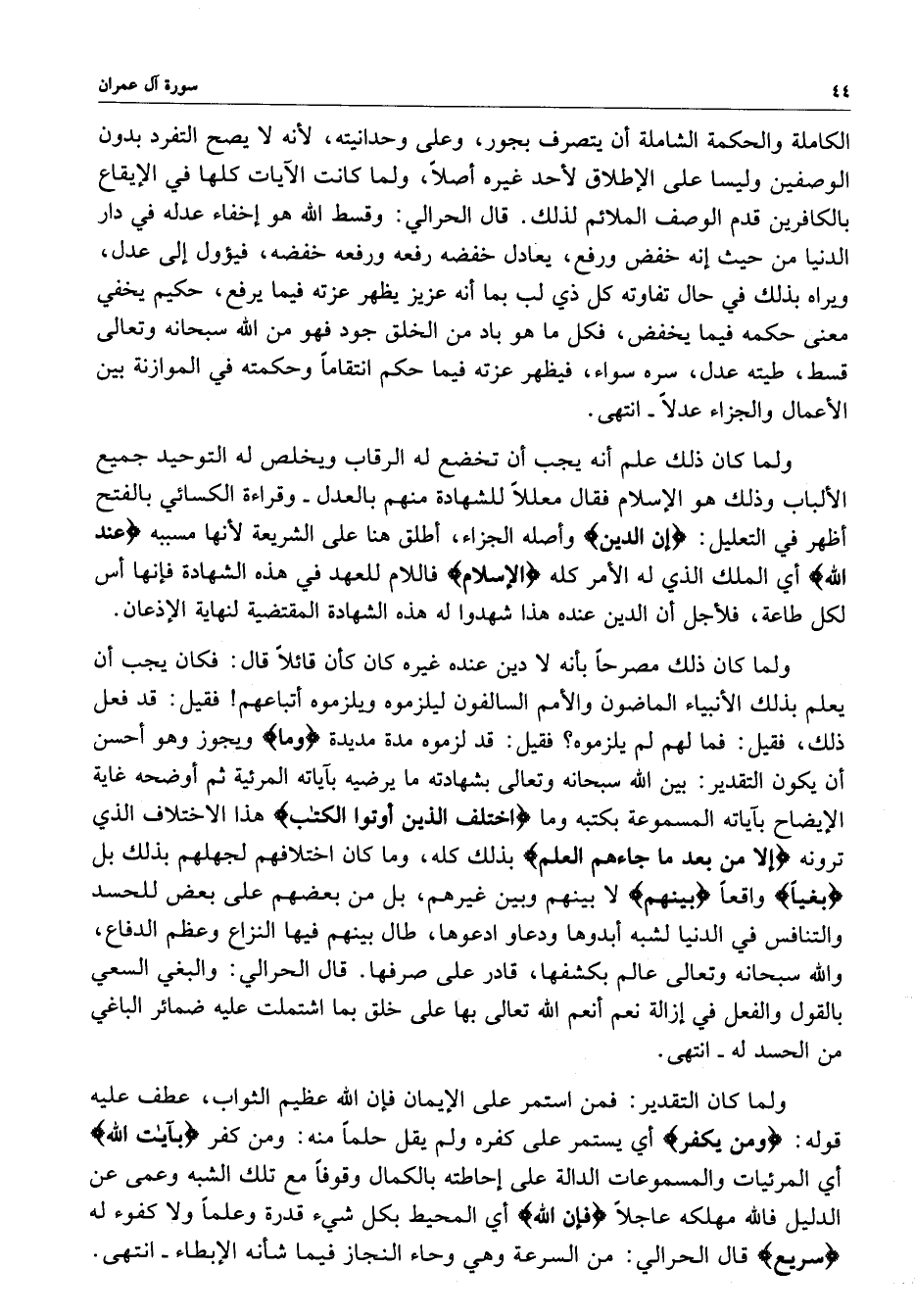 ولما كان ذلك علم أنه يجب أن تخضع له الرقاب ويخلص له التوحيد جميع الألباب وذلك هو الإسلام فقال معللاً للشهادة منهم بالعدل - وقراءة الكسائي بالفتحد أظهر في التعليل : ( إن الدين ( واصله الجزاء ، أطلق هنا على الشريعة لأنها مسببة ) عند الله ) أي الملك الذي له الأمر كله ) الإسلام ( فاللام للعهد في هذه الشهادة فإنها أس لكل طاعة ، فلأجل أن الدين عنده هذا شهدوا له هذه الشهادة المقتضية لنهاية الإذعان ولما كان ذلك مصرحاً بأنه لا دين عنده غيره كان كأن قائلاً قال : فكان يجب أن يعلم بذلك الأنيباء الماضون والأمم السالفون ليلزموه ويلزموه أتباعهم فقيل : قد فعل ذلك ، فقيل : فما لهم يلزموه ؟ فقيل : قد لزموه مدة مديدة ) وما ( ويجوز وهو أحسن أن يكون التقدير : بين الله سبحانه وتعالى بشهادته ما يرضيه بآياته المرئية ثم أوضحة غاية الإيضاح بآياته المسموعة بكتبه وما ) اختلف الذين أوتوا الكتاب ( هذا الاختلاف الذي ترونه ) إلا من بعد ما جاءهم العلم ( بذلك كله ، وما كان اختلافهم لجهلهم بذلك بل ) بغياً ( واقعاً ) بينهم ( لا بينهم وبين غيرهم ، بل من بعضهم على بعض للحسد والتنافس في الدنيا لشبه أبدوها ودعاو ادعوها ، طال بينهم فيها النزاع وعظم الدفاع ، والله سبحانه وتعال عالم يكشفها ، قادر على صرفها .