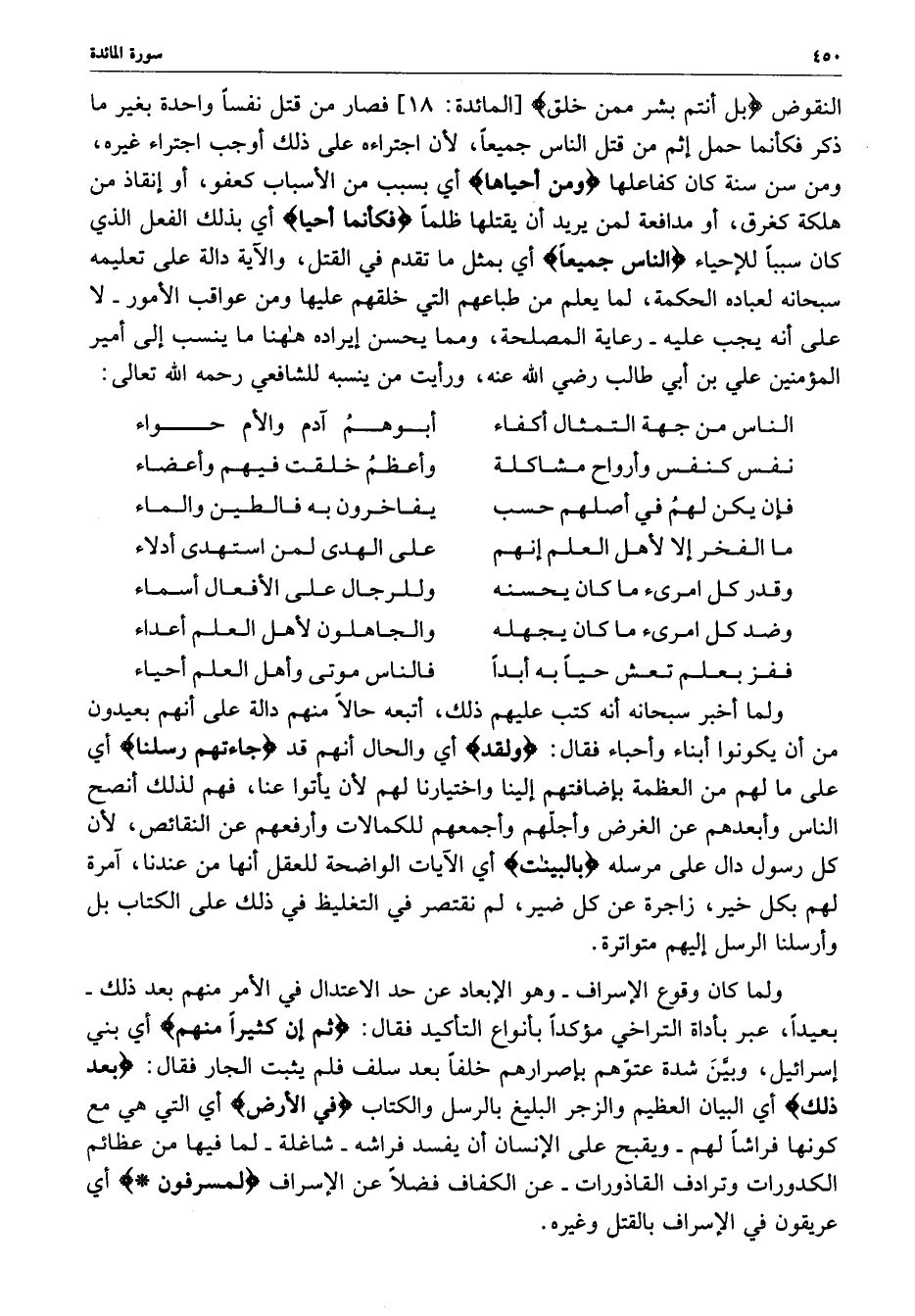 [ المائدة : 18 ] فصار من قتل نفساً واحدة بغير ما ذكر فكأنما حمل إثم من قتل الناس جميعاً ، لأن اجتراءه على ذلك أوجب اجتراء غيره ، ومن سن سنة كان كفاعلها ) ومن أحياها ) أي بسبب من الأسباب كعفو ، أو إنقاذ من هلكة كغرق ، أو مدافعة لمن يريد أن يقتلها ظلماً ) فكأنما أحيا ) أي بذلك الفعل الذي كان سبباً للأحياء ) الناس جميعاً ) أي بمثل ما تقدم في القتل ، والآية دالة على تعليمه سبحانه لعباده الحكمة ، لما يعلم من طباعهم التي خلقهم عليها ومن عواقب الأمور - لا على أنه يجب عليه - رعاية المصلحة ، ومما يحسن إيارده هاهنا ما ينسب إلى أمير المؤمنين علي بن أبي طالب رضي الله عنه ، ورأيت من ينسبه للشافعي رحمه الله تعالى :
